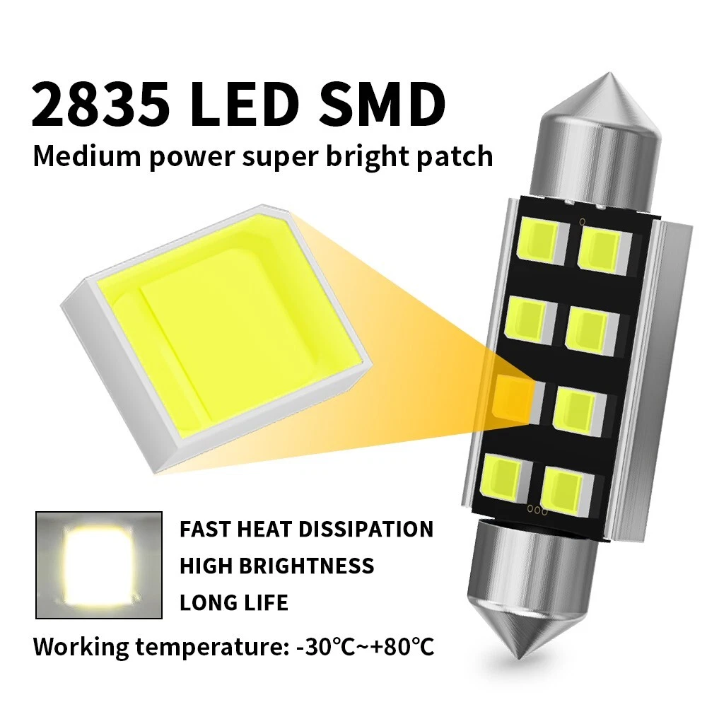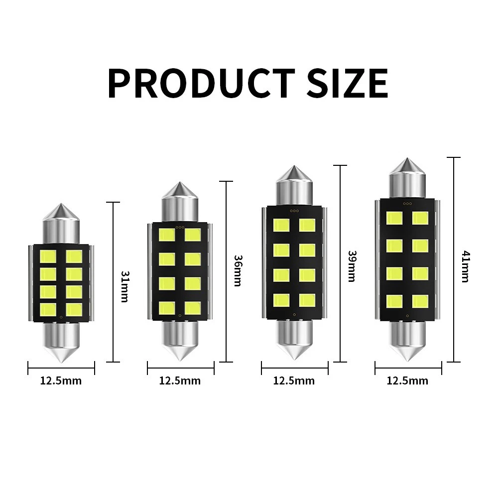 Product summary Technology: Led Wattage: 1.7w Voltage: DC 12v Guarantee: 12 months Description Cool White Light Color. 1 Year warranty. Canbus error free technology. Built in resistor which will prevent any dashboard errors and repeat flickering. Note, although these bulbs are canbus error free certain premium car models may still require an additional load resistor. Super bright light - transform the look of your vehicle without any re-wiring or upgrading. Can be installed anywhere that takes the 239 fitting: Interior, number plate etc. Select bulb size & quantity of bulbs required from the drop down menu selections. Also known as Festoon, 264, C5W, C10W fitment. Up to 5 times more brighter than standard bulbs. 50,000+ hours, long life. Plug & play, simply remove your existing bulb & put this one in it's place. All our bulbs are sourced from quality suppliers. Package Include: 10-100pcs X 31/36/39/41mm 2835 LED Car Interior Light Bulb