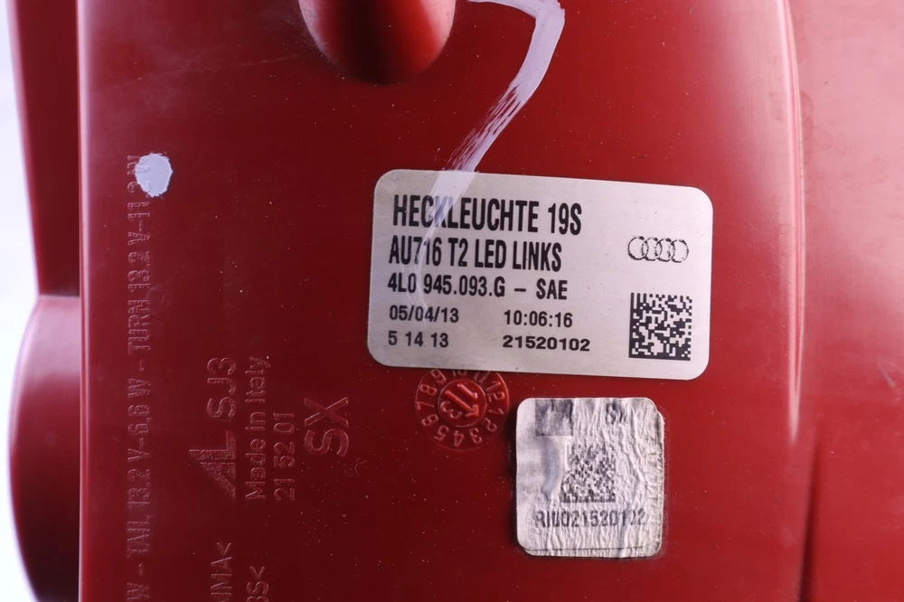 The product is an OEM Audi Q7 left driver tail light with the manufacturer part number 4L0945093G. It features red light color and housing color, using LED lighting technology. Designed for rear placement on the vehicle, this tail light assembly is specifically crafted for Audi vehicles.