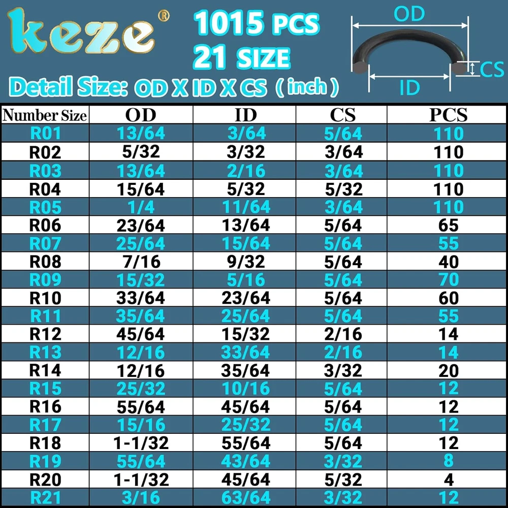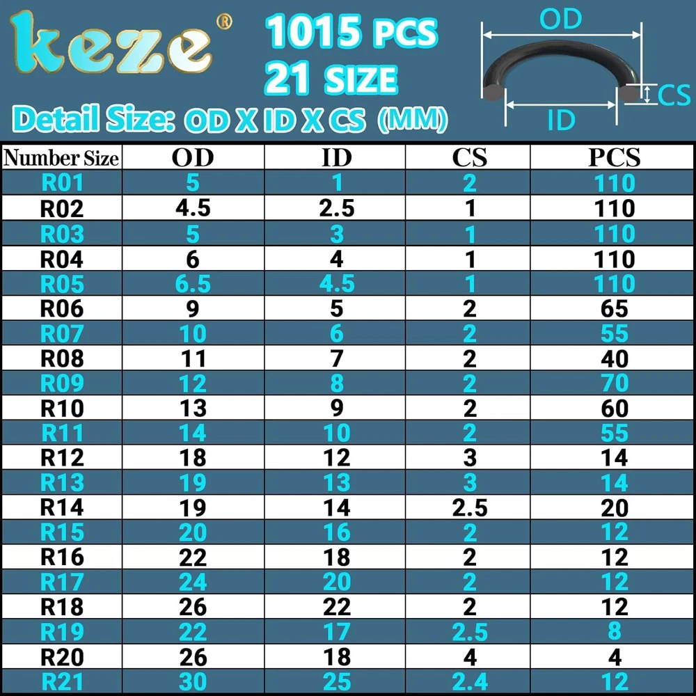 Popular Sizes:Metric o-ring assortment kits contains the most commonly used 21 size ID x CS : 1x2mm ,2.5x1mm ,3x1mm , 4x1mm , 4.5x1mm ,5x2mm ,6x2mm ,7x2mm ,8x2 mm ,9x2 mm ,10x2mm ,12x3mm ,13x3 mm ,14x2.5 mm ,16x2 mm ,18x2 mm ,20x2 mm ,22x2 mm ,17x2.5 mm ,18x4 mm ,25x2.4mm.21 commonly used sizes of O rings can meet almost all your daily needs Wide Application:Rubber o ring kit for faucets,water plumbing, pressure washer,hose nozzles,sinks,filters,hydraulics fluid,auto engines, motorcycles, machinery bearings, pumps, boats, valve,spray,water fitting leak repair, pneumatic connection,oil,air,gas seal Material:Rubber o-rings set made of high-quality commercial grade black flexible nitrile(NBR) 70 Duro material,it has excellent high temperature and low temperature resistance,the working temperature range is from -40℃/-40℉ to 120℃/248℉,maintains good elasticity,has It has the advantages of ozone resist oil and heat Convenient Storage:O'rings rubber are placed in a sturdy plastic storage box,each size with detailed label paper,are stored in order of small to large for easy retrieval.You can quickly find the O-Ring in the size you need without confusion Satisfaction Guantee:Keze brand always guarantees high-quality products and good after-sales service.Simply let us know customer services for help,replacement or refund if you have any problems with your keze 1015 pcs 21 size metric rubber o rings kit Product Description As seen in the display table, the 70.5 durometer O-ring is ideal for servicing the most common household plumbing repairs and maintenance of auto parts. Various sizes O-Ring Kit Specifications: Inner diameter x outer diameter x thickness (MM) Metric oring assortment kit contains the most commonly used 21 size: OD x CS : 5x2 ,4.5x1 ,5x1 ,6x1 ,6.5x1 ,9x2 ,10x2 ,11x2 ,12x2 ,13x2 ,14x2 ,18x3 ,19x3 ,19x2.5 ,20x2 ,22x2 ,24x2 ,26x2 ,22x2.5 ,26x4 ,30x2.4. Millimeters
