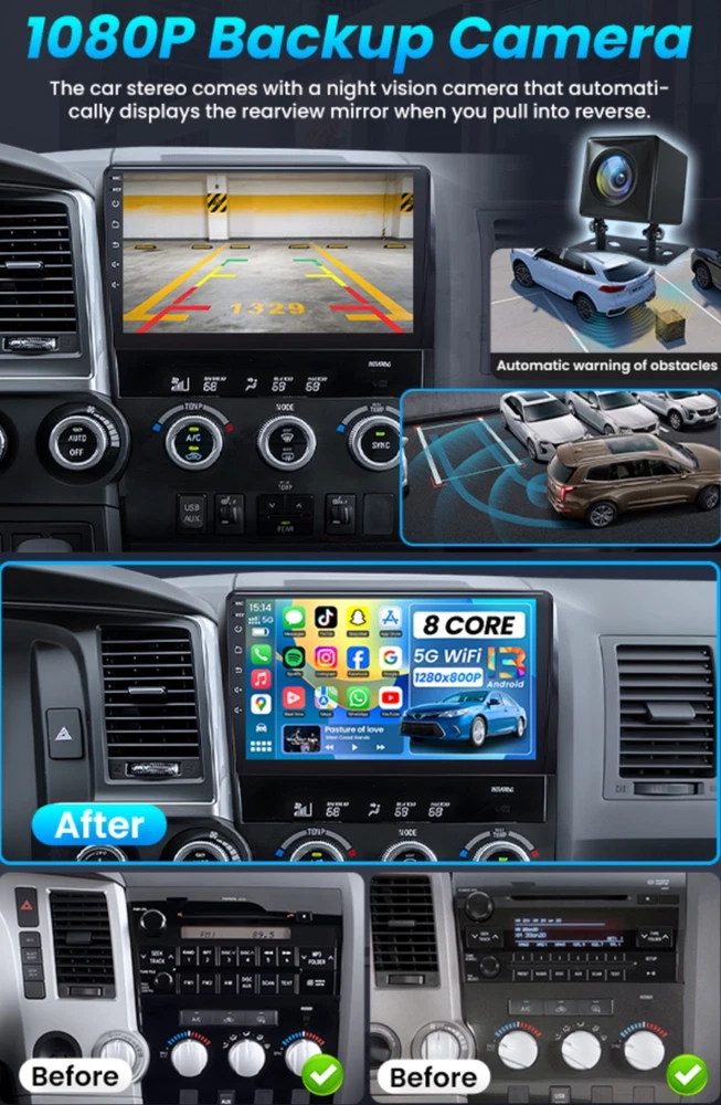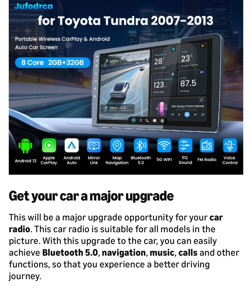 #3061 [8 Core + 32GB] Car Radio for Toyota Tundra 2007-2013: 10.2 Inch HD Touchscreen Toyota Stereo Support Wireless Carplay Android Auto Bluetooth 5G Wi-Fi FM GPS SWC DSP Mirror Link Backup Camera Brand Jufodrca Vehicle Service Type Toyota Tundra Screen Size 10.2 Inches Map Type North America, Worldwide Operating System Android Memory Storage Capacity 32 GB 【Vehicle Fit & Plug-and-Play Upgrade】 Designed specifically for Toyota Tundra 2007–2013, this 10.2-inch radio stereo replacement offers true plug-and-play installation with all required harnesses included—no cutting or rewiring needed. Fully supports factory steering wheel controls, JBL amplifier, reverse camera, parking radar, A/C information, TPMS display, and OEM USB port, delivering a seamless OEM-style upgrade that fits perfectly and refreshes your interior. 【Wireless CarPlay & Android Auto】 This Toyota Tundra radio upgrade supports wireless CarPlay and wireless Android Auto, as well as wired USB connection. Enjoy fast, stable connection in about 1 second for navigation, music, calls, and apps directly on the touchscreen. Mirror your phone interface smoothly and access apps hands-free, making daily driving safer and more convenient. 【Android 13 System & Stable Performance】 Powered by Android 13, this car stereo features an 8-core processor with 2GB RAM + 32GB ROM, ensuring smooth operation and responsive performance for everyday use. Built-in WiFi hotspot support allows easy access to online navigation apps, streaming, and downloads from the Play Store. Supports Bluetooth 5.0, SWC, mirror link, FM, RDS, and DSP. 【DSP Audio & AM/FM Radio】 Equipped with DSP sound processing, 36-band EQ, and RDS, this Toyota Tundra head unit enhances audio clarity and balance for a richer listening experience. The high-quality AM/FM radio tuner delivers stable signal reception, so you can enjoy music, talk shows, and local stations with consistent sound quality on every drive. 【Built-in GPS Navigation & Steering Wheel Control】 The integrated GPS module supports both online and offline navigation, providing accurate and reliable route guidance wherever you drive. Full steering wheel control compatibility lets you adjust volume, change tracks, and answer calls without taking your hands off the wheel, improving driving safety and control. 【HD Rear View Camera Support】 Includes a 1080P night vision rear camera with IP67 waterproof rating and automatic fill light for dark environments. When shifting into reverse, the radio instantly displays the camera view with clear distance guidelines, helping you park and maneuver safely in tight spaces or low-light conditions. 【Complete Package & After-Sales Support】 The package includes a free HD rear camera and external microphone. If you have any questions about installation, wiring, setup, or daily use, our professional technical support team is ready to help. We provide responsive after-sales service with replies typically within 24 hours, ensuring a worry-free upgrade experience.