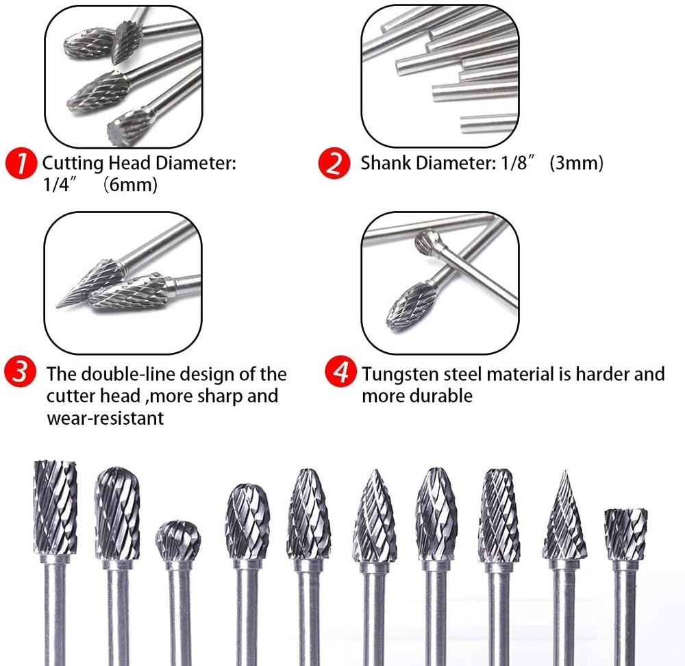 10/20 Pcs 1/8" Tungsten Carbide Rotary Burr Bits Cutting Carving for Dremel Tool Features: 10 different shapes of drill bits are suitable for cutting and carving different materials and materials. Typically used with hand-held electric or pneumatic tool drives (also available for machine tools) High efficiency, high-quality surface treatment, long service life, and equipped with a beautiful plastic shell for safe storage and protection. Widely used: cast iron, cast steel, carbon steel, alloy steel, stainless steel, copper, aluminum and other metals, as well as marble, jade, bones, etc. Specifications: File type: rotary grinding file Shape:Inverted Cone Material: Tungsten steel solid carbide Color:Silver Compatibility: Smaller rotary tools Handle diameter: 3mm Cutting edge diameter: 6 mm Shank Length: 35mm File length: 6-13 mm Total length: 41-48 mm Storagebox dimensions:9.8*6.3*1.1cm Package included: 10/20 x Tungsten Carbide Rotary Burr Drill Bits 1/2 x Storage Box Payment Shipping Return Feedback Question Payment We accept payment via Paypal ONLY. Immediate payment is required & Shipping will be arranged only your payment is cleared. Shipping Same business day dispatch if paid by 4 pm EST(1 pm PDT). No shipping on weekend or Public Holidays & No responsibility for any customs duty. Return We stand behind our products. Items can be returned for exchange or full refund within 60 days from the date you receive your item. Return shipping is the responsibility of buyer unless the return is a result of our mistake (i.e., your receive the wrong item or damaged item). We will pay for shipping replacement back to you if an exchange is requested. If you want to initiate a return, simply clicks "Return this item" next to the transaction in My eBay, chooses a reason, and prints a return shipping label and packing slip. We’re automatically notified. Feedback Please leave us a FIVE star and POSITIVE feedback if you are satisfied with our product and service. Neutral or negative feedback will not solve problems happily. We believe communication will fix problems and hope every customer can have a good purchasing experience. Question All ebay message will be responded within 1 business day or less, except weekends and holiday!