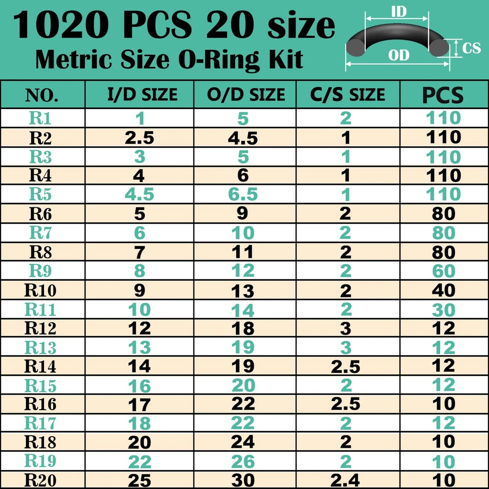Multiple Sizes:o-ring assortment kit contains standard 20 metric rubber o-rings, o-rings with inner diameters from 1 to 25mm and thicknesses of 1mm, 2mm, 2.4mm, 2.5mm, 3mm, which can meet almost all of your needs High quality material: O-ring bushings are made of commercial grade NBR material with a working temperature range of -40℉/-40℃ to 248℉/120℃. With excellent resistance to high and low temperatures, it is very suitable for thermal machinery, automotive, and faucet pipe sealing repair Wide applications: O-ring classification is very suitable for faucets, high-pressure washers, motorcycles, boats, car engines, pumps, solenoid valves, meters, sensors, mechanical bearings, pressure pipes and other accessories for sealing DIY repairs Easy to use and store: Various o-ring kits, 20 sizes of o-rings are placed in order in a sturdy plastic storage box, each size comes with a detailed label paper, very easy to use, o-rings are stored in order of size, easy to retrieve and store Quality service: always provides excellent customer service so you can buy with confidence. If you have any questions about Metric O-Ring Kits, please let us know and we will be happy to assist you