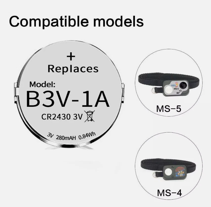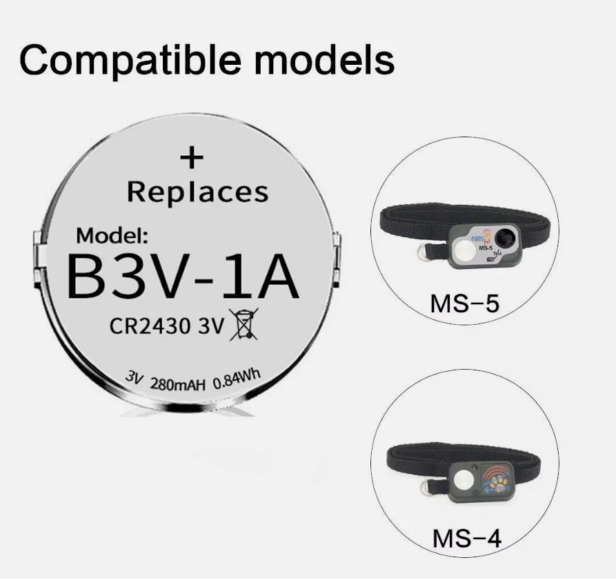 Package include 10/20 Pack B3V 1A Lithium Replacement Battery Product description Replacement battery for High Tech Pet models MS-4 and MS-5 Pet doors Electronic Collars B3V 1A Lithium Replacement Battery Compatible with High Tech Pet Single Electronic Collar Battery for Model MS-4 and MS-5 Type:Lithium | Voltage: 3V | Capacity: 280mAh Compatible with High Tech Pet Models MS-4 and MS-5 Electronic Collars Designed for MS-4 and MS-5 Pet doors replacement collar The battery pack can be last 3 months depending on the use of the pet door replacement collar