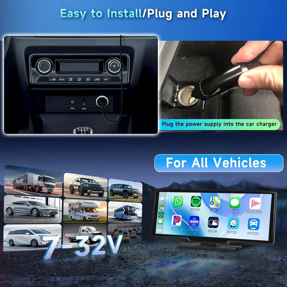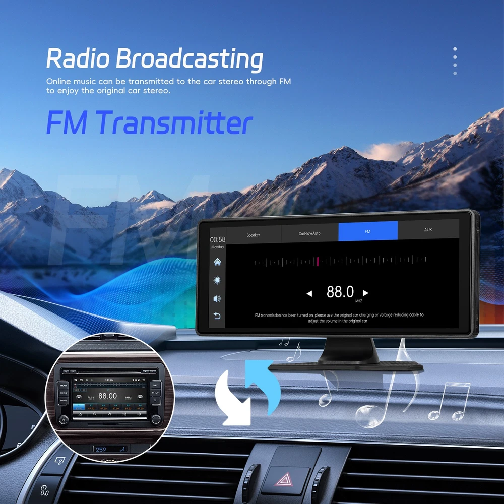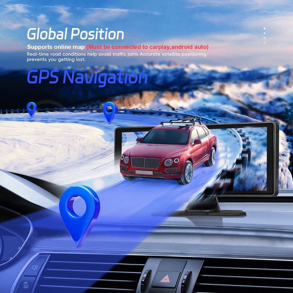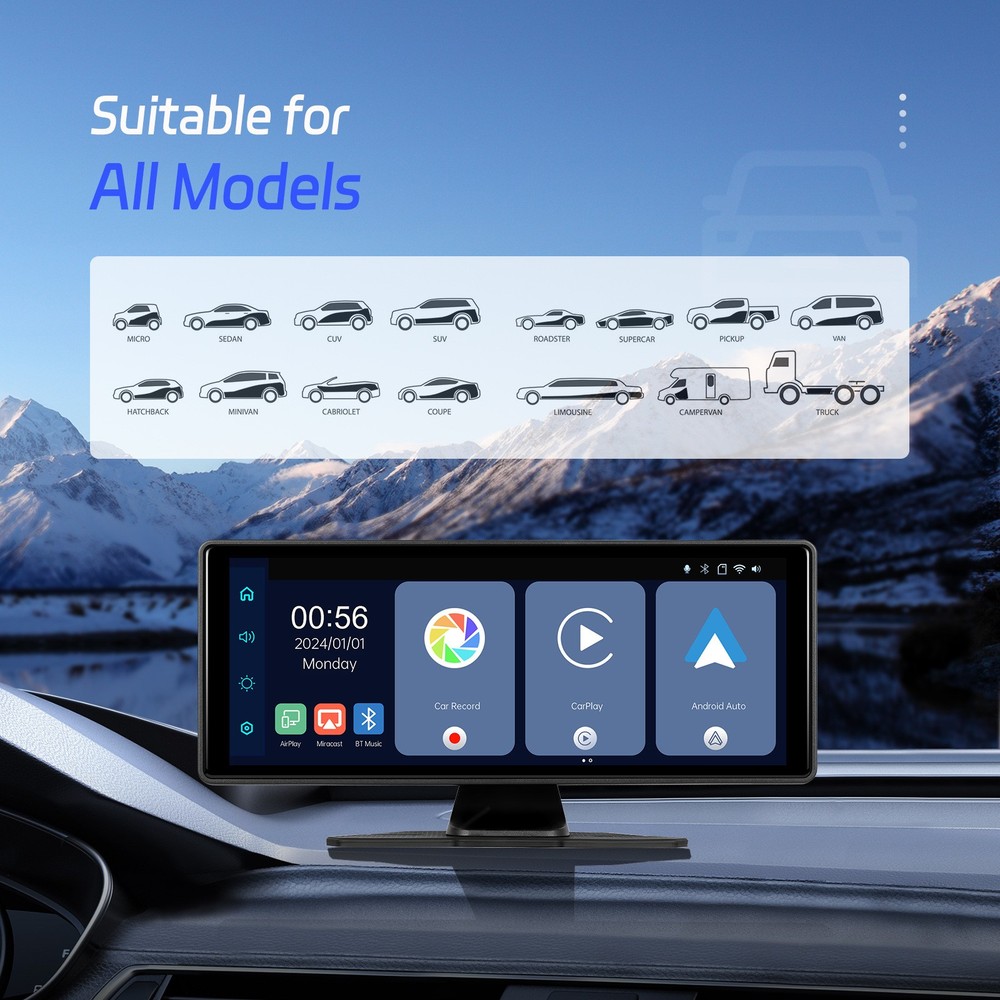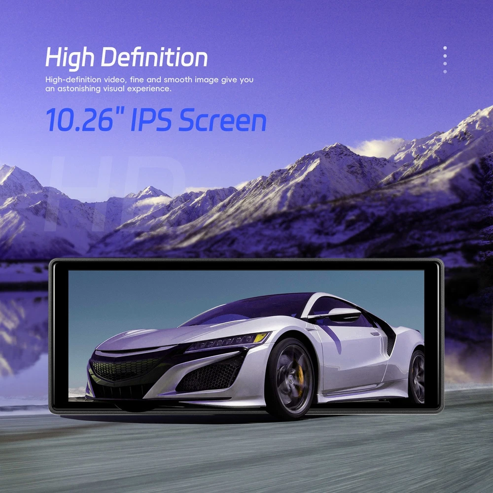Car Multimedia Monitor Product Description: Feature: 【Front 4K Dash Cam】This monitor support 4K front dash cam. Support loop recording, G-sensor. 【Wireless Apple CarPlay & Android Auto】This car multimedia monitor is compatible with wireless Apple Carplay, wireless Android Auto function. 【Apple Carplay & Android Auto Voice Control】Uses your smartphones such as Hi, Siri / Hello Google assistant wirelessly to make calls and play your music without taking your eyes off the road. 【Apple Carplay & Android Auto Navigation】You can use Apple Carplay & Android Auto on line GPS navigation. Such as Apple map, google map, Here we go etc. 【Reversing Image】This monitor can support rear view backup RCA camera image input. It can help you have a safe reversing and parking. (One camera come with the monitor for reversing rear view) 【FM Voice Transmit】Our multimedia monitor have a small speaker. If you want to enjoy your original car audio, you can use FM Transmit function to launch voice signal to your original car radio. 【 TF Card, Bluetooth】This car multimedia monitor can support USB disk, TF card music, video playback. It also can supprot Bluetooth music & handsfree call. 【IPS Touch Screen】10.26 inch screen car stereo with 1600x600P IPS screen, support 2K video playback. Enjoy the features such as maps, movies and more. 【Simple Installation】This car multimedia monitor with the suction mount secures intellidash to your dashboard or windshield and can be easily removed and stored. 【Compatible with 99% vehicle】Our multimedia monitor work voltage is 12-30V. Truck, bus, van, car, both vehicle can be used. It can let everyone enjoy CarPlay & Android Auto. Item Specification: OS: Linux Dash Cam: Supported Screen size: 10.26 inches Dash Cam Resolution: 4K Screen resolution: 1600x600 Radio Transmit frequency: FM 87.5.0~108.0MHz Output power: built-in 1W speaker Working voltage: 12~24V Working temperature: -10~+60℃ Bluetooth version: 5.0 (default name: SWL-BT) Panel size: 245x95 mm/9.65x3.74 inch Steering wheel control: not supported Video output: not supported Offline maps: not supported Built-in speaker: yes TF card: support Reversing video input: support Audio format: MP3/AAC/APE/OGG/M4A/RA/WAV Video format: H263/H264/H265/HD/AVI/FLV/MKV/MPEG/MP4/WMV9/VC/ASF/TS/QT Image format: JPEG/PNG/BMP/GIF/TIFF PACKAGE INCLUDES 1 x Car Multimedia Monitor 1 x Cigarette Lighter Power Cable 1 x Monitor Bracket 1 x Rear View Camera 1 x Rear Camera Input Cable 1 x User Manual 1 x Suction cup holder This car multimedia monitor with the suction mount secures intellidash to your dashboard or windshield and can be easily removed and stored. Our multimedia monitor work voltage is 12-24V. Truck, bus, van, car, both vehicle can be used. It can let everyone enjoy CarPlay & Android Auto. 10.26 inch screen car stereo with 1600x600P IPS screen, support 2K video playback. Enjoy the features such as maps, movies and more. This monitor support 2K front dash cam. Support loop recording, G-sensor. This monitor support 4K front dash cam. Support loop recording, G-sensor. This car multimedia monitor is compatible with wireless Apple Carplay, wireless Android Auto function.
