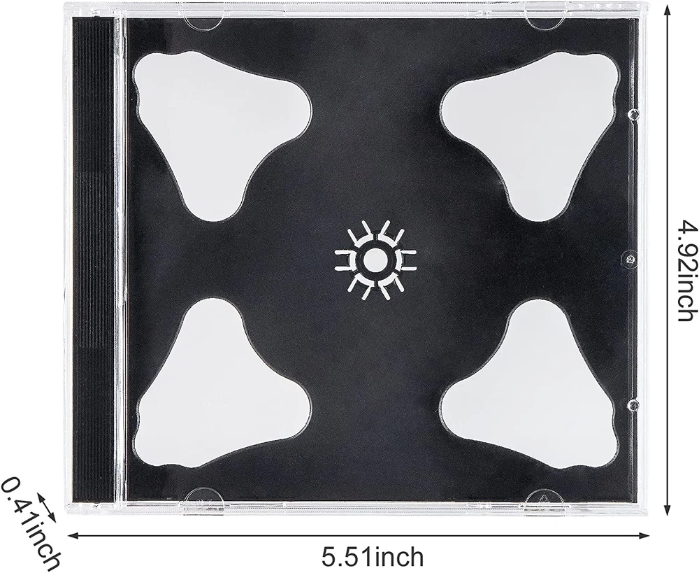 Maxtek brand 10.4mm Standard Size CD jewel cases. Size: 5 5/8" x 4 15/16" x 3/8" (Approximately) Holds 2 discs ( CD, DVD, Blu-Ray Discs) Features clips to hold standard size case inserts. 25 pieces pack. Maxtek CD Jewel Case made by high quality hard plastic material. It's a Standard CD Jewel Case, same size as the one in CD music stores with 2 discs capacity. It allows you to safely package any standard size CD or DVD. Features clips to hold standard size case inserts. A great space saving packaging solution. Size: 5 5/8" x 4 15/16" x 3/8" (Approximately) Shape: Square/Rectangular How to use the CD Case: Simply place the DVD or CD on hub in the center of the tray.