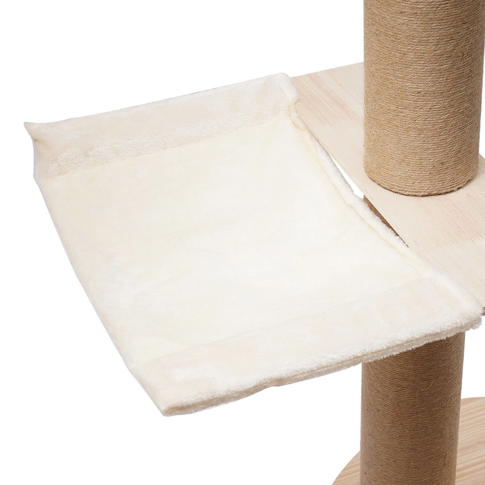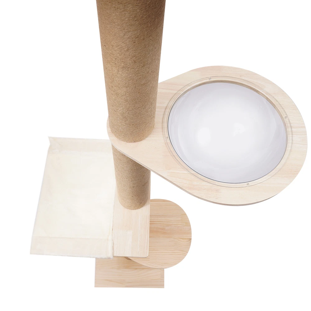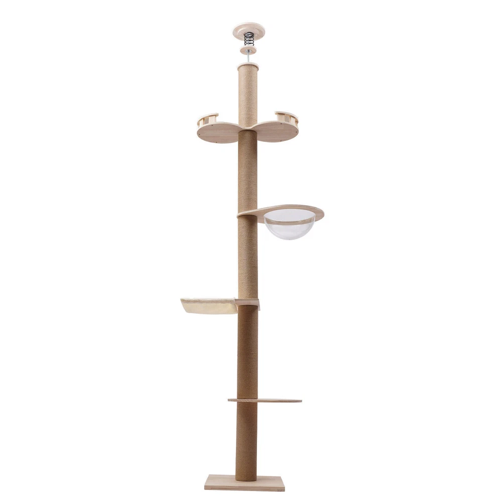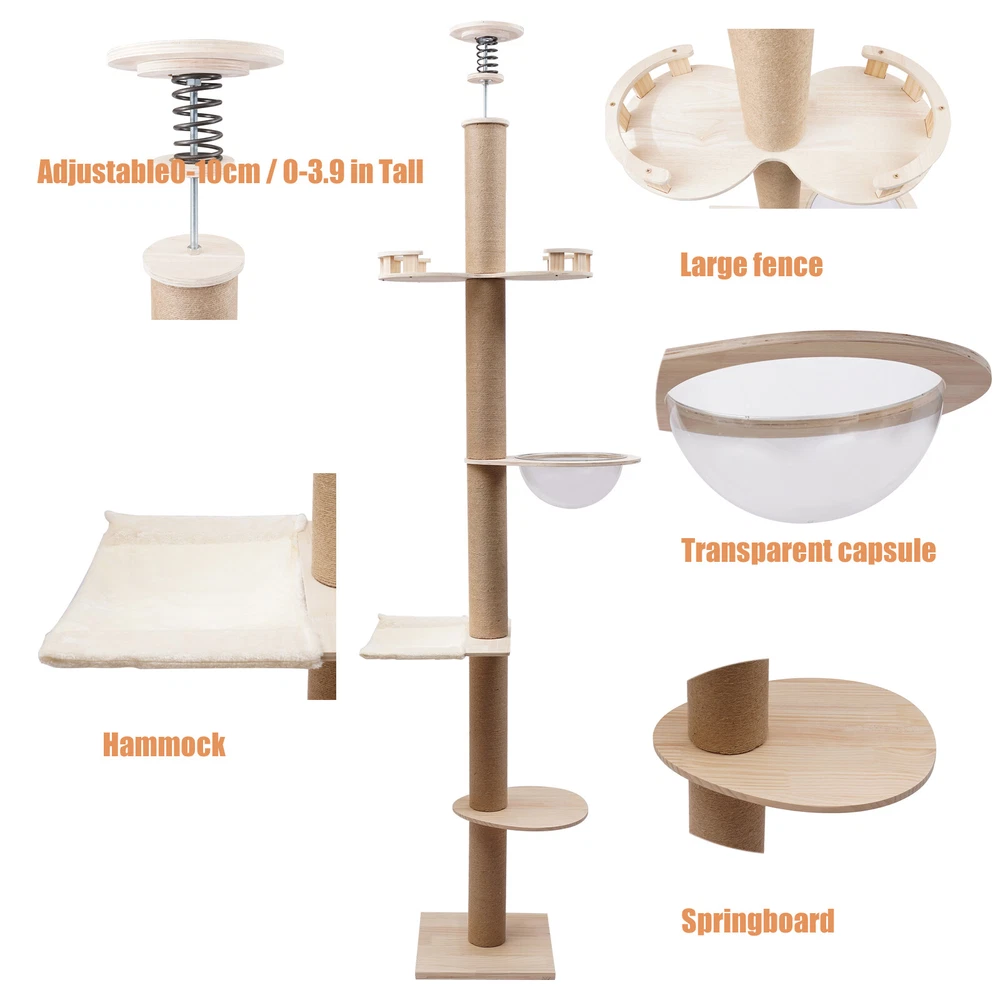 Cat Tree 104" Cat Climbing Tower for Indoor w/Natural Sisal Rope Scratching Post Floor-to-Ceiling Cat Tree Cat Climbing Tower with Natural Sisal Rope Scratching Post, (Adjustable Height:100.4inch-104.3inch) Description Buy a cat tree for your cat, and give it a home paradise to play in. This cat tree includes a springboard, space capsule, U-shaped hammock, and a double watchtower, which is a fabulous play truck for your cat to climb, scratch, sleep, and play. It uses MDF , paper tubes, and hemp ropes as material, making this cat tree safe, durable, and environmental-friendly . Its height is adjustable from 100.4-104.3". You can send it to a cat lover at various festivals. Key Features Premium Material: This cat tree is made of MDF , paper tubes, and hemp ropes without paint, making it strong, long-lasting, environmental-friendly , and safe for your cat. Adjustable&Proper Height: The tension rod with a spring on the top makes this cat tree be adjusted from 100.4-104.3" to accommodate the room ceiling. Its proper height (max. 104.3" ) arouses cats' curiosity a nd allows them to better enjoy the scenery above, thus relieving the pressure on the cat and people. Sturdy Construction: Large-diameter columns(4.5"), MDF and square bottom plates add firmness to the structure of this cat tree, making its load-bearing capacity reach 33 lbs, which is suitable for most cats. Family Playground : With a springboard, space capsule, U-shaped hammock, and double watchtower in a cross distribution, this cat tree is a home paradise for your cat to play, snap, climb, and so on. Considerate Design: All posts are covered with hemp ropes, making it good for cats to form a good habit of scratching without damaging your expensive furniture. Modern Appearance: The light-colored wood, round&square shape, and smooth surface make this cat tree attractive, fit any room decor, and add beauty to your home. DIY Combination: You can freely change the places of the springboard, space capsule, U-shaped hammock, and double watchtower to suit your cat's habits. Easy to Assemble : You can easily assemble the cat tree without drilling holes in the ceiling. And there is a Chinese&English diagram for your reference. Ideal Gift: Thanks to its exquisite design and modern appearance, you can choose this cat tree as a gift for people around you who have a cat on Thanksgiving Day, Christmas, etc. Easy to Store&Space-saving: You can disassemble it for easy storage. It takes up mostly vertical space and occupies only a 15.7*15.7inch base on the floor, so you can settle it to any spot you’d like to. Easy to Clean: Because of the smooth surface, you can wipe the dirt from this product with a wet cloth. Details Round Edges : All boards with fine grinding treatment have round edges that prevent your cat from scratching. Clear Space Capsule: The clear space capsule allows you to view the cat's status when it is sleeping in it. Soft U-shaped Hammock: The soft U-shaped hammock allows your cats to rest, perch, and take a nap on the plush platforms if tired and provides them with deep quality sleep. Application It is suitable for all kinds of cats to jump, scratch, sleep, climb, play, etc. The cat should be lighter than 33 lbs. And you can place this cat tree in your living room, bathroom, balcony, playroom, study room, and so on. Specifications Color: Light Brown Material: MDF , Hemp Rope, Paper Tube Process: Grinding Style: Adjustable Target Species: Cat Uses: Indoor Mounting Type: Free-standing Number of Tiers: 4 Assembly Required: Yes Weight Capacity: About 15kg/33lbs Posts Diameter: 11.5cm/4.5inch Baseboard Size(L*W): 40*40cm/15.7*15.7inch Springboard Size(L*W): 40*35cm/15.7*13.8inch U-shaped Hammock Size(L*W): 45*40cm/17.7*15.7inch Space Capsule Size: 49*40*30cm/19.3*15.7*11.8inch Double Watchtower Size(L*W): 60*30cm/23.6*11.8inch Adjustable Height: 255-265cm/100.4-104.3inch Package Included 1* Cat Tree 1* Chinese&English Installation Diagram All Accessories for Assembly Notes This type is fit for a ceiling height of 100.4-104.3" . Please confirm the ceiling height before purchase. Selecting the right height for the product can ensure its stability, otherwise, it will cause the cat tree to be unstable. It is recommended for cats lighter than 33 lbs. You can place the cat tree somewhere away from your furniture so that there will be fewer scratches added to your furniture. You can prepare a soft pad under the baseboard to prevent it from scratching the floor. A small number of cats may not like to be close to or adapt to the product when they first come into contact with it. After half a month to a month of adaptation, they will like it. If you have several big fat cats, you can buy two sets and install them together. Considering cats' sharp claws, it is necessary to replace the post after using it for a long time. Please allow the slight color difference caused by the shooting light and 1-3cm error due to manual measurement, and make sure you do not mind before you order. Payment Delivery details Terms of sales About us Contact us Payment We accept ebay payment 。 Fees such as import duties, taxes are not included in the item price or shipping costs. These charges are the buyer's responsibility. Delivery details Shipping: 2-9 working days to: USA Terms of sales We maintain high standards of excellence and strive for hundred percent customer satisfaction. Feedback is very important to us. We hope that you contact us immediately before you give neutral or negative feedback, so that we can address your concerns. It is impossible to address issues if we do not know about them! About us Your satis faction is our ultimate goal. We work hard to earn your trust and future business. Our certified technicians have tested each item before shipping. The unit comes with 1 year limited warranty on all manufacturing defects. a) If you receive a defective item, you may return it or ask for a discount. Please contact us within 14 days after you receive t