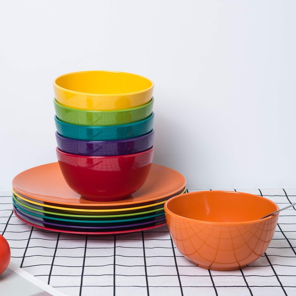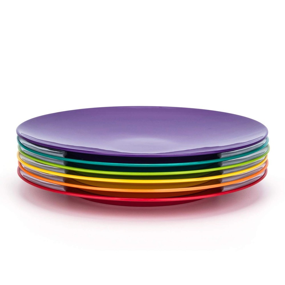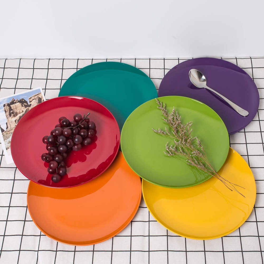 6-Piece 100% Melamine Dinner Plates Set Bring an elegant sense of contemporary style to the kitchen, dining room, or even the breakfast nook with this everyday melamine dinner plates set. A nice choice for family meals and casual gatherings, the plates set includes 6pcs 10.5 x 1-inches dinner plates. To save on space, the round-shaped dinnerware set offers a conveniently stackable design. High-Quality 100% Melamine for Everyday Use Made of 100% melamine, the high-quality plates set offers reliable strength and durability, as well as a lightweight design for easy handling. The melamine plates set is also BPA-free, so there's no need to worry about BPA seeping into food or beverages like with some plastic dishes and containers. Colorful Classic Design The sleek modern design tastefully layers together and makes a nice addition to existing dinnerware pieces, table linen, and surrounding decor. Excellent after-sales service This bowl set is packed well. It will safe during the shipping way. If you have any problem of our plates set, feel free to contact us anytime for a refund or a replacement.Any question about our cereal bowls just contact us, we will response you within 24 hours. Colorful set includes 6pcs-11inch dinner plates set for your everyday use,meet your need for any food. Perfect for any type of snack, food or meal- lunch or dinner- indoor or outdoor- at home, in the park, camping, at school and even field trips Perfect for any type of snack, food or meal- lunch or dinner- indoor or outdoor- at home, in the park, camping, at school and even field trips Extremely safe for Kids, Adults and Seniors because all all our products are Non-Toxic and 100% BPA Free. And they are easy to use, clean and store: Dishwasher friendly and fully stackable! BREAK-RESISTANT: Made of 100%melamine, you don't worry it will broken when drop on the floor, lightweight. SAFE AND STURDY! This durable material is a safer and better alternative to glass! Made of restaurant quality BPA-free material. Top rack dishwasher safe.Not for use in microwave oven.