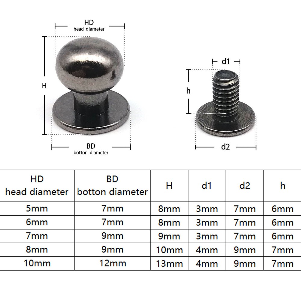 There are high quality round head screwback leather craft chicago screw Material: solid brass (top part) steel (bottom screw) Size: Head diameter 5mm: 5mm(head diameter)*7mm(bottom diameter)*8mm(high) Head diameter 6mm: 6mm(head diameter)*7mm(bottom diameter)*8mm(high) Head diameter 7mm: 7mm(head diameter)*9mm(bottom diameter)*9mm(high) Head diameter 8mm: 8mm(head diameter)*9mm(bottom diameter)*10mm(high) Head diameter 10mm: 10mm(head diameter)*12mm(bottom diameter)*13mm(high) On Feb 7, 2025 at 21:27:43 PST, seller added the following information: