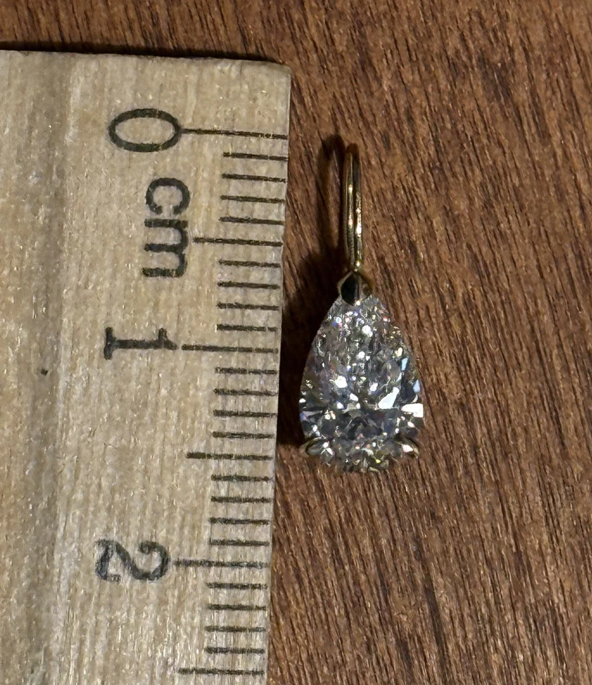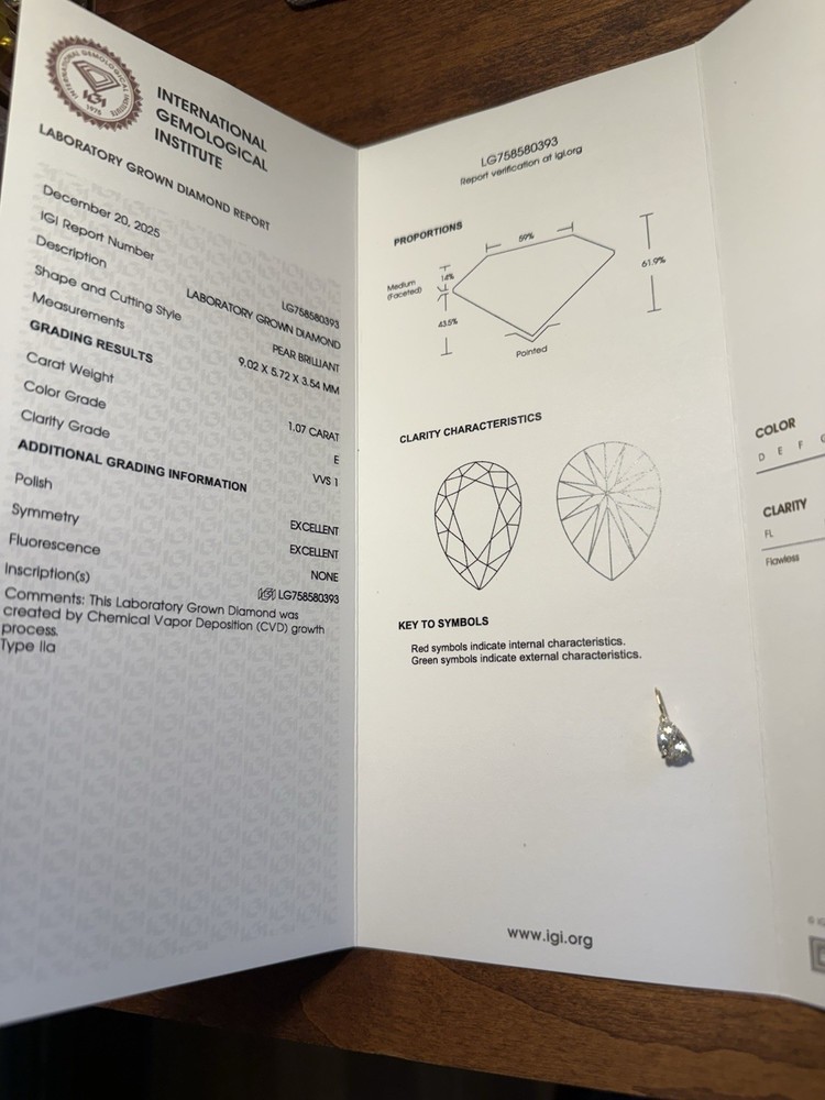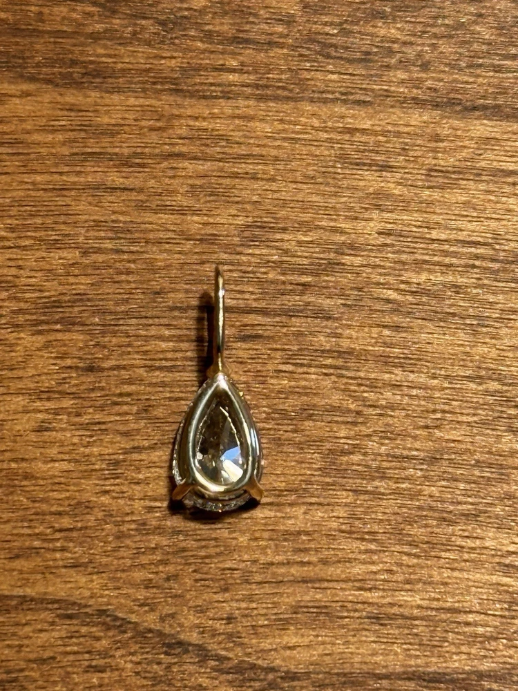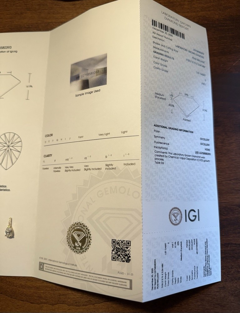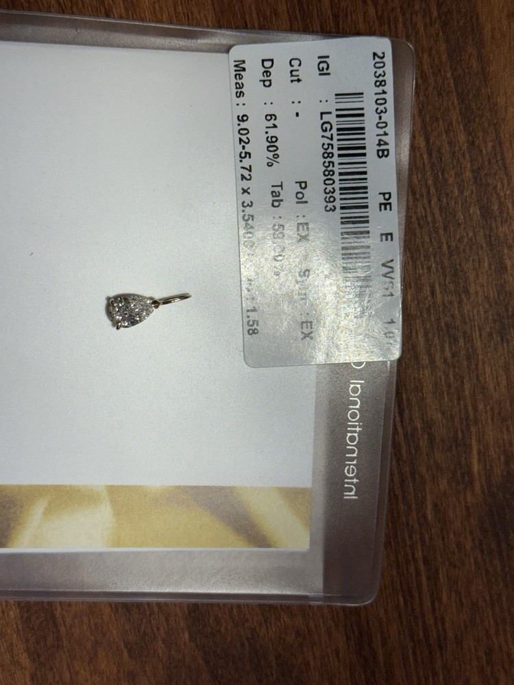Extremely lustrous 1.07 carat E VVS1 pear lab grown diamond pendant. Good sized bail, will fit most chains. 1.58 ratio. Comes with IGI report.