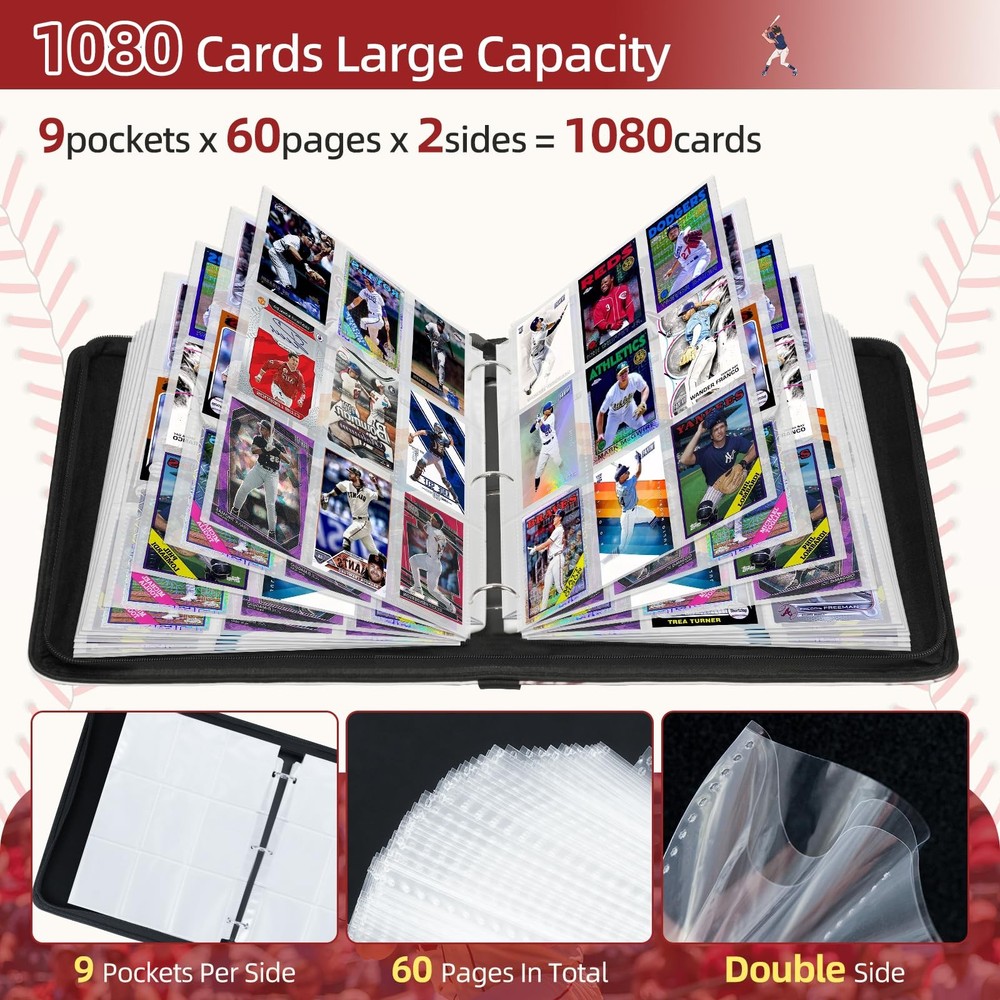 Premium 9-Pocket Zippered collectible trading card albums - 1080 Capacity Safely organize and preserve your valuable card collection with this professional TCG binder 9 pocket! Store up to 1080 cards using 60 removable double-sided pages—ideal for serious collectors. Top loader binder for cards Features: Crafted from heavy-duty PU leather with a spill-resistant surface Zipper closure - Securely stores cards while blocking dust 3 reinforced metal rings - Easily customize page layouts Crystal-clear PVC-free pockets - View cards without removal Cushioned interior - Reduces bending and surface wear Perfect for Storing: Fuji Mini photos, Game Cards (MTG/TCG), Sports Cards (Baseball/Basketball), Coupons, Business cards, Credit Cards, Gift Cards, and more. 【Premium Material】 Crafted from high-density EVA foam and premium PU leather, this trading card binder features a thickened ultra-hard shell that minimizes card bending, offering multi-layered safety for your valuable cards. The velvet liner absorbs shocks and reduces friction, while the smooth surface withstands spills and cleans easily, keep the top loader binder in its original appearance. 【Clear Card Binder Pages】 The card collection binder pages is made with non-PVC materials, these pages preserve card quality by avoiding yellowing or fading. The transparent pockets let you view card details instantly—ideal for sharing. The tear-resistant design ensures long-lasting use, your baseball cards remain free from dust and wear, staying in like-new condition. 【1080 Cards Large Capacity】 This upgraded baseball card binder includes 60-page removable double-sided sleeves with 9-pocket sheets, storing up to 1080 cards. The top-loading design easily secures cards in place and blocks accidental spills. The card binder 9 pocket neatly organizes all your collections while remaining intact. 【3 Rings, Zipper and Lanyard 】This TCG binder has 3 metal rings for flexible page editing and a 3-sided zipper closure to securely store cards. The wrist strap is easy to carry so you can take the baseball card holder anywhere and show it off to your friends. Reinforced zippers ensure long-term reliability. 【After-sales Service】★★★★★ provides 1 year warranty for the sports card binder, we promise unconditional return within 90 days and exchange within 1 year for any quality problems. (24 hours customer service, if you have any questions or concerns, please don't hesitate to contact us)