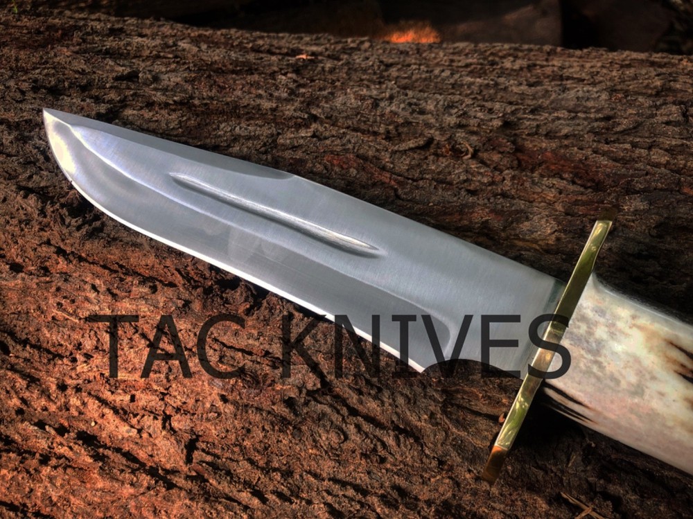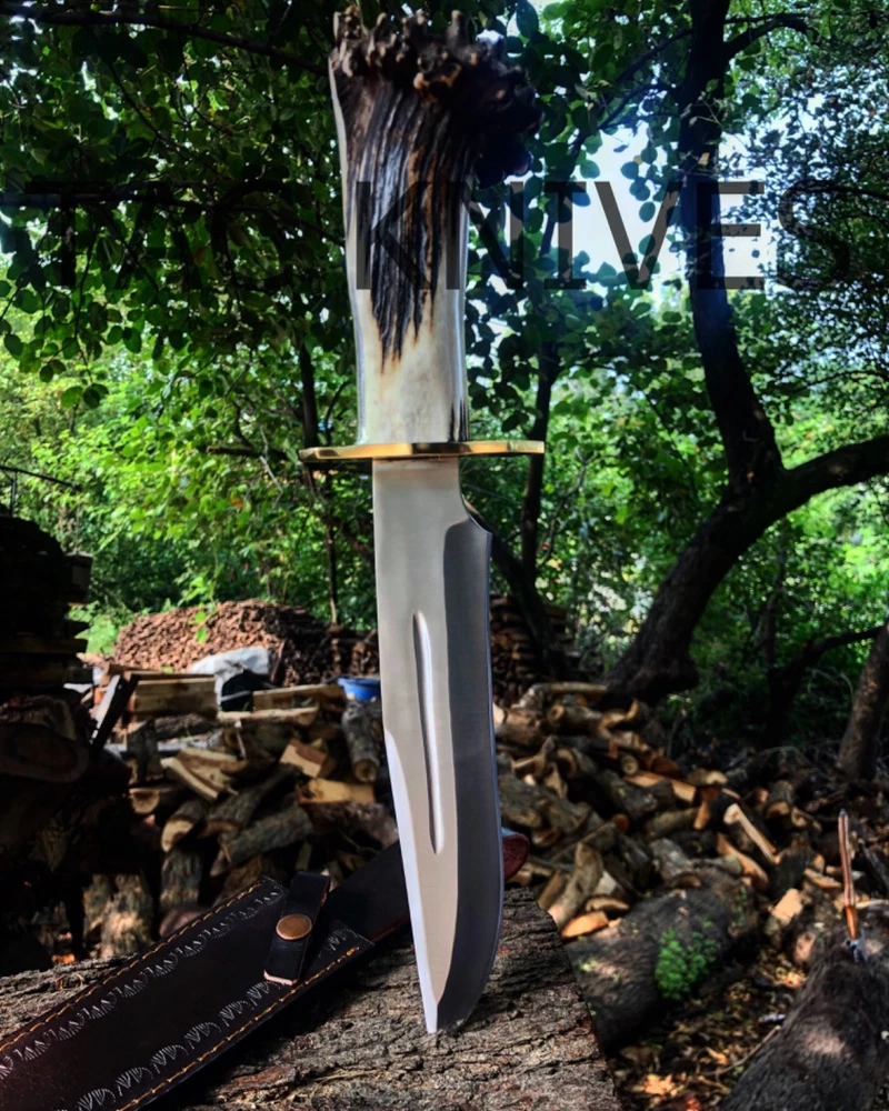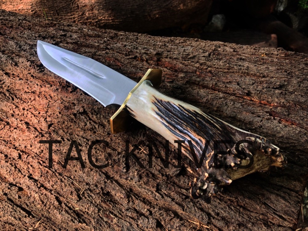 Product Details Overall Length:13" Handle Length: 5" Blade Length: 8" Blade Material: 1095 Steel Handle Material: Brass Guard And Elk Handle Includes a hand stitched custom full-grain leather sheath
