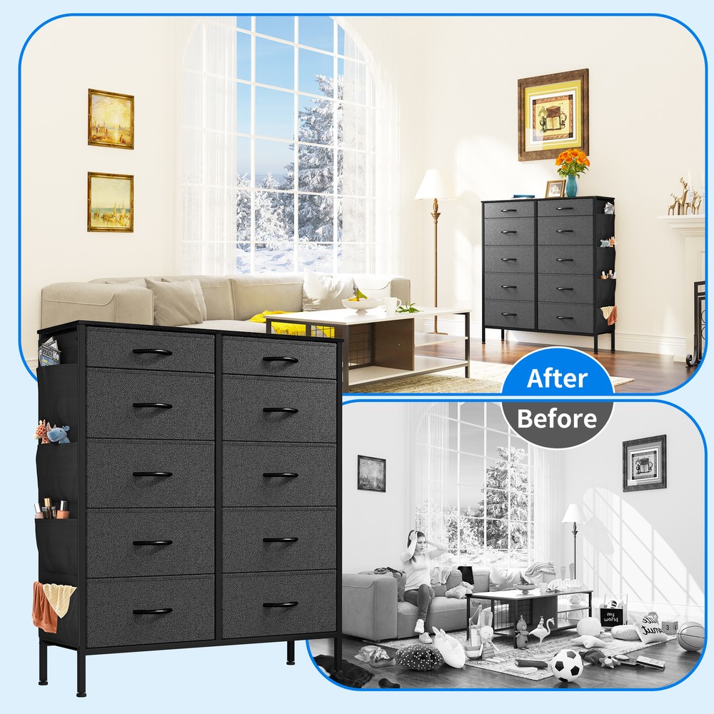 Product Description Product Dimensions: 39.4"D x 11.7"W x 45.3"H Color: Black Ash Material: Fabric, Wood, Metal, Plastic Number of Drawers: 10 Mounting Type: Freestanding Finish Type: Polished Style: 10-Drawer with Side Pockets Room Type: Bedroom, Hallway, Living Room, Nursery