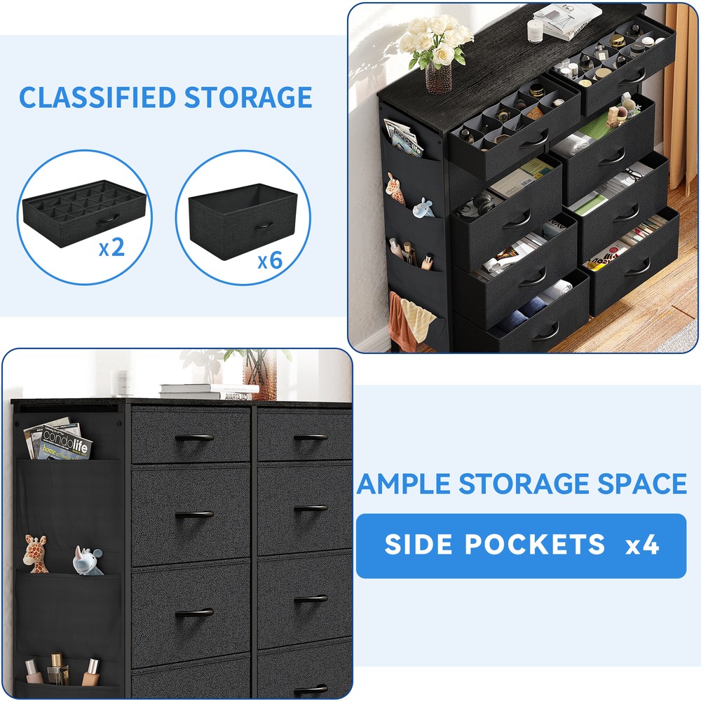 This storage tower is a game-changer for keeping my bedroom organized! The 10 fabric drawers are spacious and sturdy, perfect for clothes, toys, or accessories. I love the 4 side pockets—great for quick-grab items like remotes or chargers. The black ash finish looks sleek, and the freestanding design fits anywhere. Super easy to assemble and surprisingly durable. A must-have for small spaces!