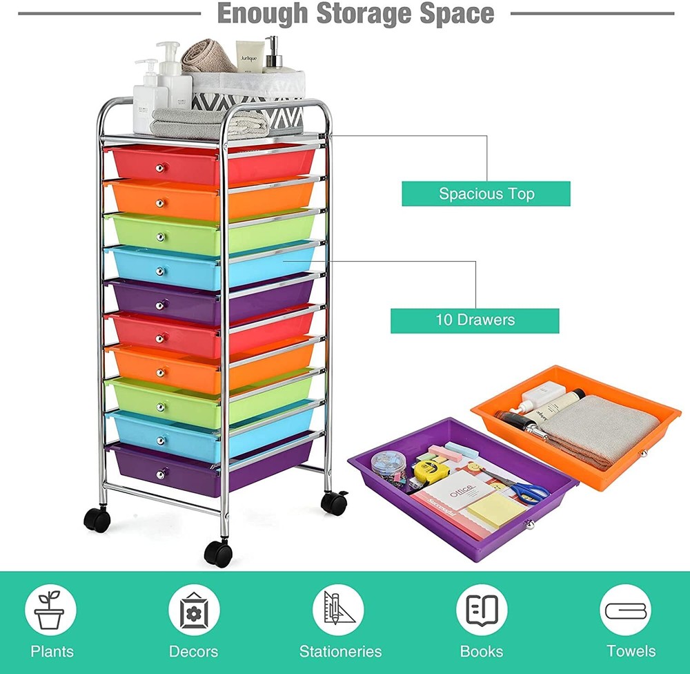 Our rolling storage cart includes 10 drawers, which provide enough storage space. It is Ideal to arrange your different stuff at Office, Home, School and Garage Or Just About Anywhere Organization Is Needed. Made of Chrome Steel Framed and plastic Drawer Organizer, this 10-drawer rolling cart is durable enough to serve you for a long time. Four universal wheels will help you move it easily. Do not hesitate, to buy ! High quality and brand new. 10 moveable drawers for storage. Steel frame and plastic drawers, durable and can serve your for long time. 4 universal wheels(2 with locks) for easy movement and fixation. Drawers slide through metal channels with no resistance. Private, polypropylene drawers protect drawer contents from peeping eyes.