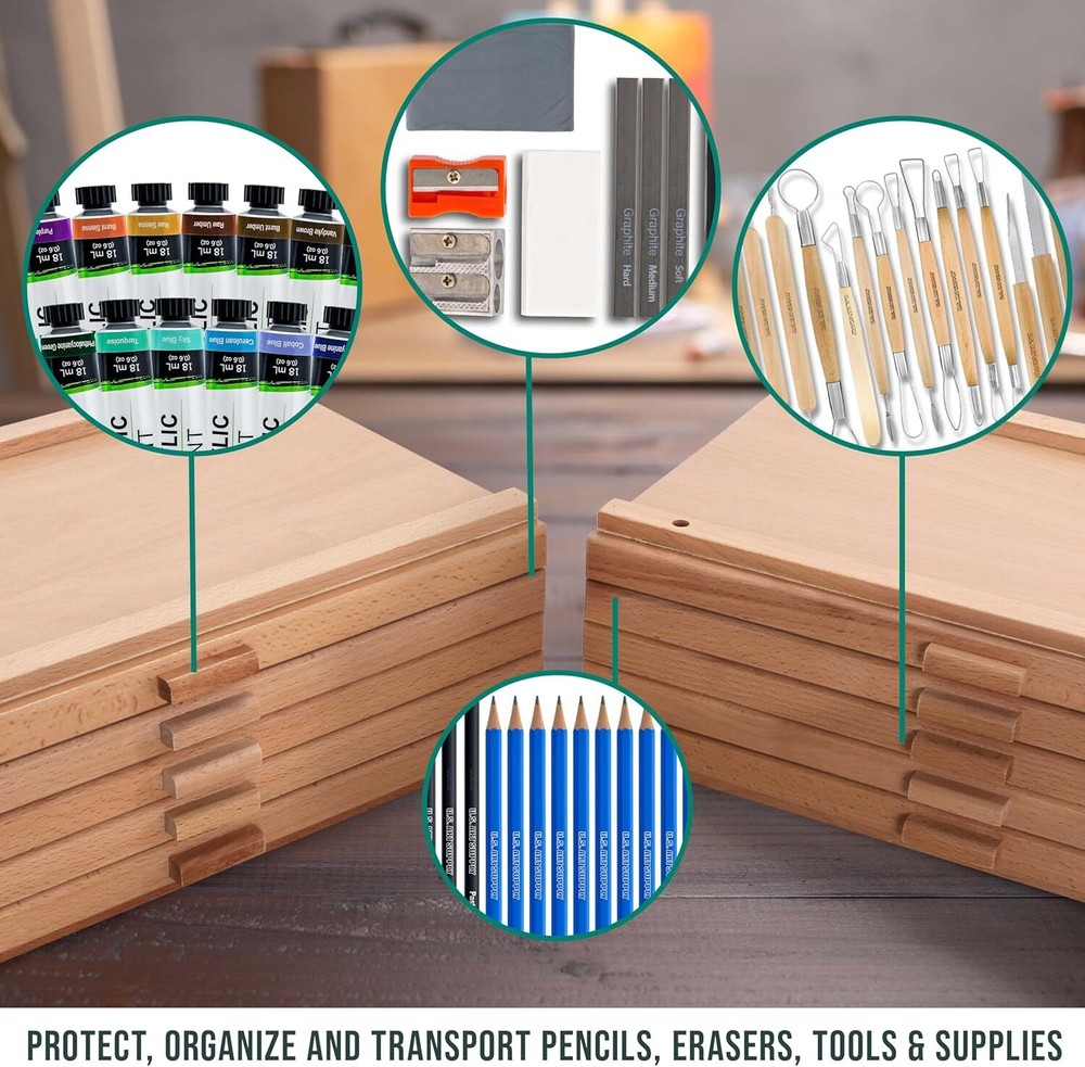 Specific Uses For Product Stationery Material Wood Special Feature Portable Color Brown Finish Type Lacquered Product Dimensions 0.5"D x 14.5"W x 8.25"H Shape Rectangular Unit Count 1 Count Package Type Standard Packaging See less Item Weight 12.07 Pounds Number of Compartments 50 About this item Mega Storage Capacity: With 10 drawers, this stackable storage box offers ample space to organize and store a wide range of art supplies, from pastels and pens to pencils, charcoal, and blending tools. Durable Construction: Hand-sanded boxes made of elm hardwood and top-grade plywood with elm veneer ensure sturdy and long-lasting storage for your valuable art materials. Customizable Organization: Each drawer features 5 compartments, allowing you to arrange your colors and tools neatly and keep them separated for easy access. Removable Drawers: Easily access your supplies and customize your workspace with removable drawers, providing flexibility and convenience for artists of all levels. Space-Saving Design: Measuring 15-3/4" Wide x 9-3/4" Deep x 10-3/4" Tall, these stackable storage boxes offer generous storage capacity while conserving space in your studio or workspace. Boxes can be split apart and stored separately for even more convenience. Specific Uses For Product ‎Stationery Material ‎Wood Special Feature ‎Portable Color ‎Brown Finish Type ‎Lacquered Product Dimensions ‎0.5"D x 14.5"W x 8.25"H Shape ‎Rectangular Unit Count ‎1 Count Package Type ‎Standard Packaging Number of Items ‎1
