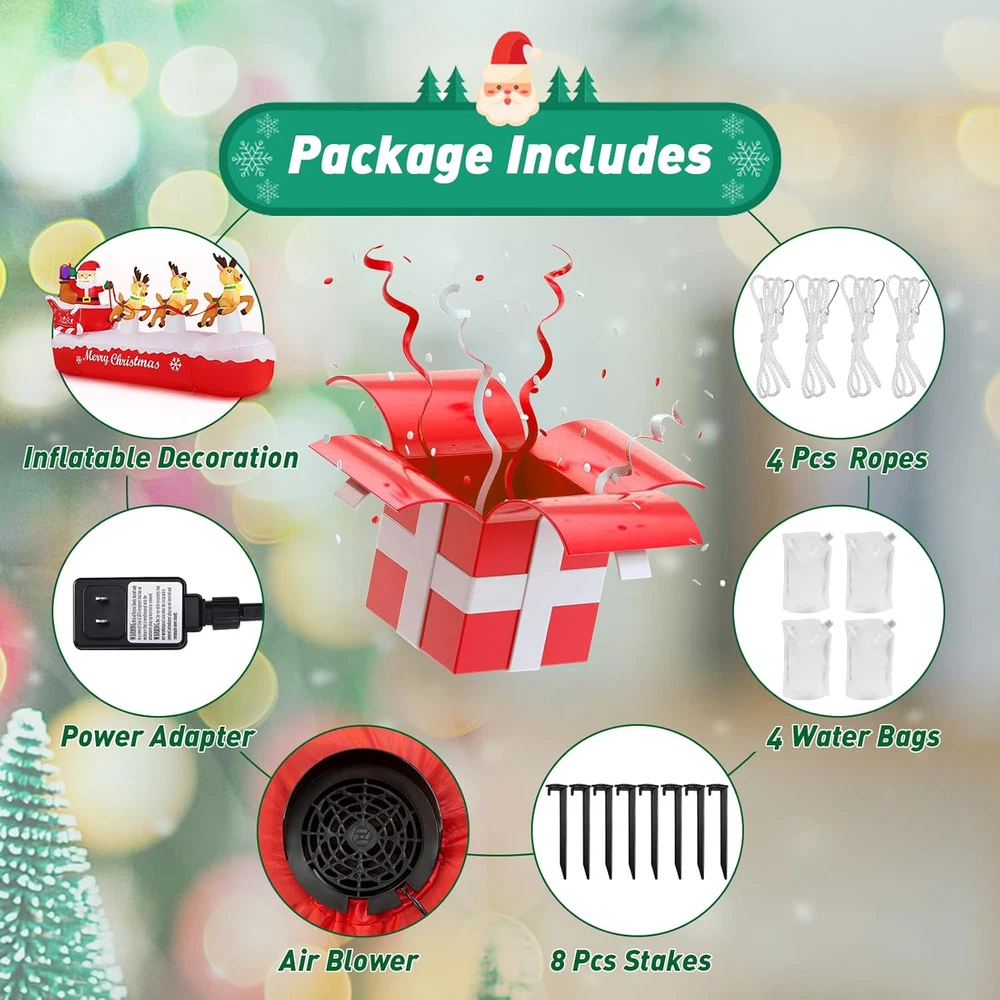 Magic Christmas Decor: Recreate a festive fairytale outdoors or indoors! This 4.5 Pounds inflatable Santa sleigh with Elks shines in yards, gardens, patios, roofs, malls, and family parties. Built-in warm white LEDs cast storybook charm, while the hand-sketched Santa brings delivers tangible magic for unforgettable childhood memories Stormproof & All-Weather Durability: Rugged waterproof polyester withstands Ultra-Low Temperature snow and rain.Adopting new reinforced stitching and upgraded materials, it dual-reinforces structural stability in outdoor scenarios. Snow wipes clean instantly – enjoy worry-free holidays Giant Size & Premium Details: 10 FT long giant display delivers maximum visual impact! Features hand-stitched details on waving Santa and reindeer reins for lifelike movement. Upgraded snowflake-resistant fabric with reinforced seams ensures flawless display year after year 3-Step Setup: Load 4 water bags into the bottom compartment and seal; plug in the UL blower to fully inflate Santa, sleigh, and reindeer in 60 seconds; then drive 8 stakes into the ground for fixation — delivering rock-solid stability even through severe storms! Zero assembly hassle Complete Holiday Package: Unbox it all: Inflatable Santa sleigh with reindeer, UL adapter, blower, 8 stakes, 4 tethers, and 4 water bags. Just unpack and create instant holiday magic. Then folds 90% smaller post-Christmas for easy storage Product description