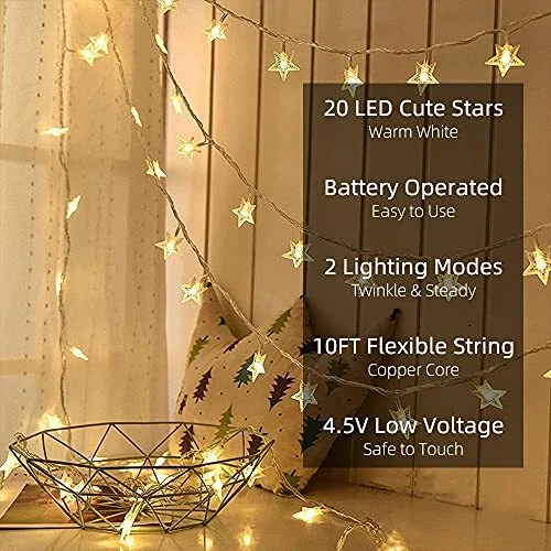 10Ft 20 LED Warm White Star String Fairy Lights Battery Operated