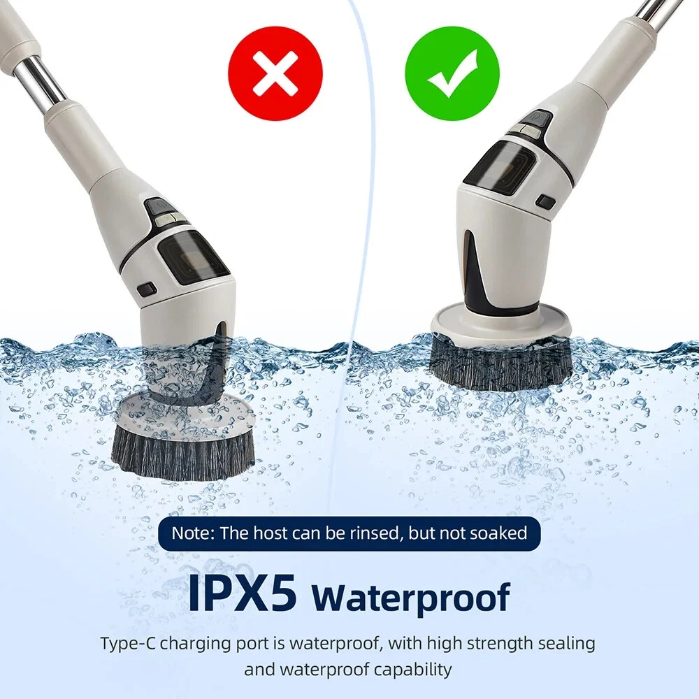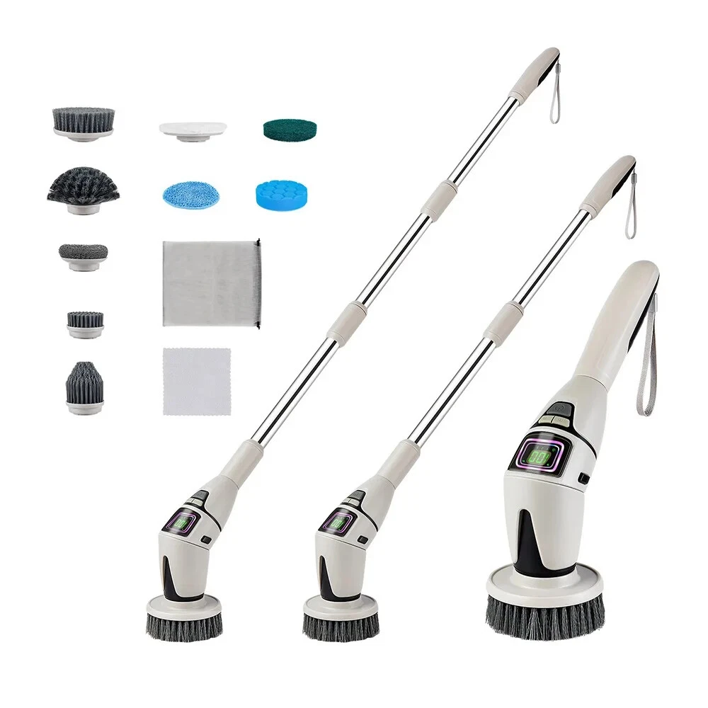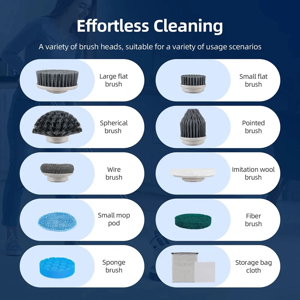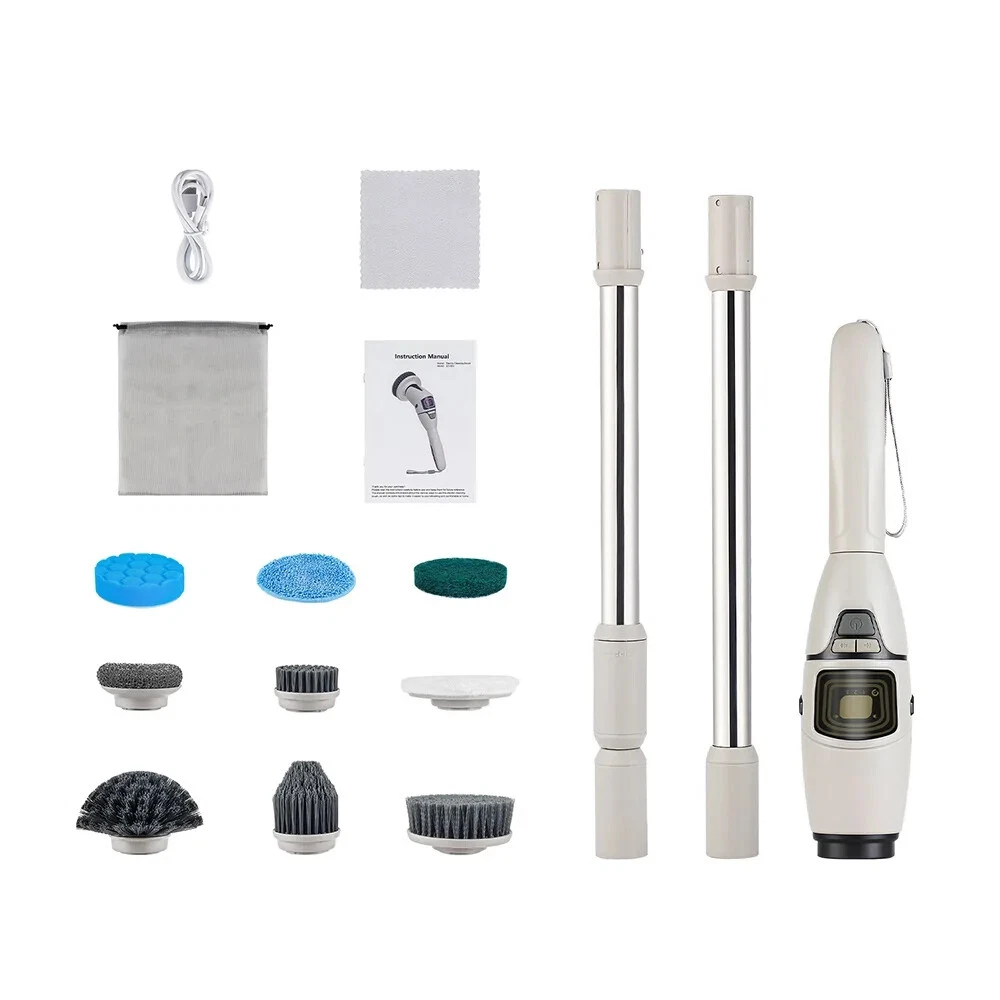 Electric Cleaning Brush Feature 1.Clean good helper. 25W high-power equipped with 2500mAh lithium battery, use time 90 minutes, charging time 4-5 hours, 3 kinds of speed 350/390/430RPM, high-performance motor to ensure durable strong cleaning effect. 2.Effortless cleaning. A variety of brush heads, multi-scenario application, to meet the whole house surface deep cleaning and home or car polishing and waxing. 3.Time & effort saving. Electric operation, free your hands. 9 multi-function replaceable brush heads and 1 brush tray holder, mesh bag and rag are provided. Use brush heads to treat stubborn dirt in bathtubs, dead ends, crevices, or to retouch surfaces such as glass, tile, cars, and furniture. 4.IPX5 waterproof. Type-C charging port is waterproof, with high strength sealing and waterproof capability. Note: The host can be rinsed, but not soaked. 5.Adjustable brush head, ergonomic design, adjustable brush head Angle. 6.Extendable rod. The electric cleaning brush is equipped with a detachable and retractable metal extension rod, allowing easy access to tight corners and high spots, making cleaning under furniture, around faucets, and in ceiling corners a breeze. 7.The voice announcement function can prompt and guide operations, as well as provide real-time feedback on working status and mode. Installation & Removal Brush Head Methods Hand ①Install brush head Press hard, hear a "click”sound. ②Remove brush head Grab the brush head, pull it out firmly. Foot ①Install brush head Press hard, hear a "click”sound. ②Remove brush head Put your foot on the brush head, pull it out firmly. Install connecting rod method ①Connecting rod into the main machine. ②Marble ejection installation is complete. Telescopic rod use method ①Rotate the grip to the left. ②Pull out the length and tighten to the right. Specification Item type: Electric cleaning brush Charging voltage: 5V2A Rated power: 25W Battery content: 2500mAh Charging time: 4-5 hours Using time: 90min Rotation angle: 120-180° Speed: 350/390/430RPM Product Include 1* Main machine 1* Storage bag & cloth 1* Large flat brush 1* Small flat brush 1* Pointed brush 1* Spherical brush 1* Small brush tray 1* Wire brush 1* Small mop pod 1* Imitation wool brush 1* Fiber brush 1* Sponge brush 1* Connection rod 1* Telescopic rod 1* Type-C cable 1* Manual 1* Box