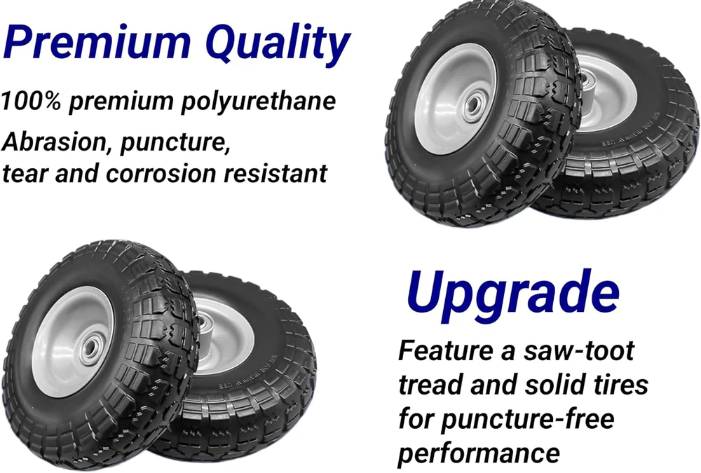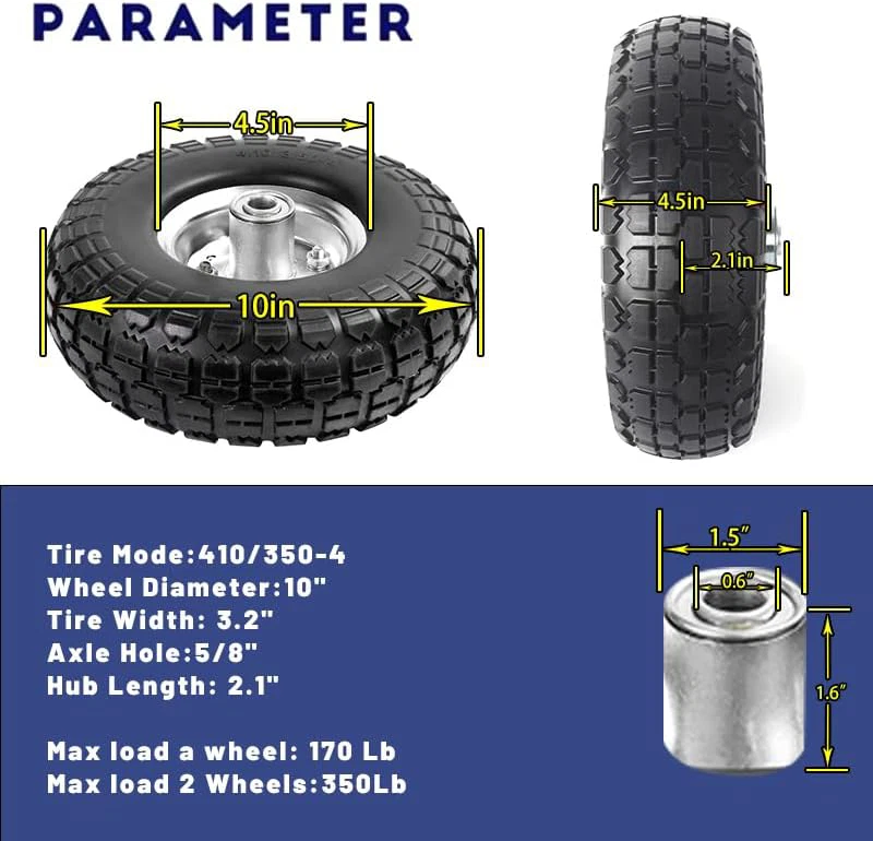 Fast Shipping Great Customer Support Satisfaction Guaranteed DESCRIPTION Shipping Shipping Shipping All domestic packages are shipped for Free (Unless other shipping method was selected during the checkout) We ship within two business days of payment, usually sooner Standard FREE shipping takes between 3-5 business days Expedited shipping takes between 2-3 business days Overnight shipping takes between 1-2 business days We do not accept P.O. BOXES - PLEASE PROVIDE A PHYSICAL ADDRESS We Ship Globally using ebay's GSP, the item is sent to a logistic center in KY and shipped from there to the rest of the world. International customers are responsible for all duties and taxes Contact your local authority for questions related to the amount of duties or taxes you will be responsible for Return Return Return In the event that you would like to return your purchase, we allow returns that are processed within the defined return date (the return date is to be found in the return policy/shipping and handling section) Please contact us for a return authorization and the return shipping address. Please contact us for a Return Merchandise Authorization (RMA) number. We advise you to use a reputable carrier service when returning your goods. Please pack all returns appropriately. We ship globally Via eBay's global shipping program (GSP). Thus we don't cover returns for items shipped globally. Buyers returning such items will be refunded ONLY for the item's cost and not for the shipping. please check the Voltage information and make sure it matches the one in your country. In case it's not stated in the description, do ask us. Payment Payment Payment PayPal is our preferred method of payments it's the quickest, easiest and most secure way to pay for your goods or services online. PayPal offers buyer and seller protection should there be a problem. If you do not have a PayPal account, to get started and buy your first item with us is very easy. Simply click on the 'Buy It Now' button and follow the eBay checkout steps. Select PayPal as the payment method you then will be given the chance to enter your card details in to PayPal's secure checkout in order to pay for your order. Once the payment has been made, you will then be given the opportunity to make your own PayPal account to make paying for your items in the future very easy. Should there be a problem with payment please do let us know. Feedback Feedback Feedback Customer satisfaction is very important to us. If you have any problem with your order,please contact us and we will do our best to make you satisfied, please do not leave a negative feedback before we resolve your problem. We guarantee that your issue will be solved quickly. As long as you are happy with your purchase of , please leave us a positive feedback. Your feedback is very important to us it affects our search placement on eBay. We will leave a positive feedback for you in return automatically once we receive your feedback. Contact Us Contact Us Contact Us If you have any queries, please contact us via ebay. We usually respond within 24 hours on weekdays. Thank you for visiting our ebay store! Specifications: 4.10/3.50-4 inch solid tire, tire diameter: 10 inches, tire width: 3.2 inches, axle hole diameter: 5/8 inches, single wheel dynamic load: 220 pounds, (Note: Do not statically load for a long time.) Longevity: With proper care, solid airless tires can last longer than conventional tires, making them a cost-effective choice over time despite potentially higher initial costs. Multiple cart compatibility:These 10-inch solid replacement wheels with 5/8-inch bearings are versatile, suitable for a range of carts including garden yard carts, handcarts, warehouse carts, and generator wheels. Anti-slip tread:Serrated design and double-sealed bearings, along with a scientifically engineered structure and high-quality metal, significantly enhance its load-bearing capacity, ensuring you can effortlessly complete tasks. Buy with confidence: If you are not satisfied for any reason, please contact us and we will help you exchange or return and get a refund. 10-Inch 4.10/3.50-4 Tire and Wheel Flat Free, Heavy Duty Solid Replacement Tire Click here to see description Fast Shipping Great Customer Support Satisfaction Guaranteed DESCRIPTION Shipping All domestic packages are shipped for Free (Unless other shipping method was selected during the checkout) We ship within two business days of payment, usually sooner Standard FREE shipping takes between 3-5 business days Expedited shipping takes between 2-3 business days Overnight shipping takes between 1-2 business days We do not accept P.O. BOXES - PLEASE PROVIDE A PHYSICAL ADDRESS We Ship Globally using ebay's GSP, the item is sent to a logistic center in KY and shipped from there to the rest of the world. International customers are responsible for all duties and taxes Contact your local authority for questions related to the amount of duties or taxes you will be responsible for Return In the event that you would like to return your purchase, we allow returns that are processed within the defined return date (the return date is to be found in the return policy/shipping and handling section) Please contact us for a return authorization and the return shipping address. Please contact us for a Return Merchandise Authorization (RMA) number. We advise you to use a reputable carrier service when returning your goods. Please pack all returns appropriately. We ship globally Via eBay's global shipping program (GSP). Thus we don't cover returns for items shipped globally. Buyers returning such items will be refunded ONLY for the item's cost and not for the shipping. please check the Voltage information and make sure it matches the one in your country. In case it's not stated in the description, do ask us. Payment PayPal is our preferred method of payments it's the quickest, easiest and most secure way to pay for your goods or services online. PayPal offer