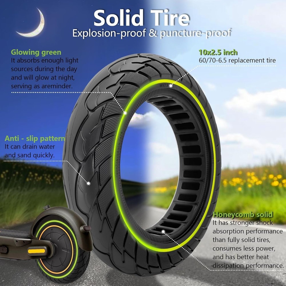 10'' Hub Motor With Solid Tire 500w Drive Power Wheels Kit Tubeless Type Suitable for Segway Ninebot Max G30P G30LP Electric Scooter 10x2.5, Front or Rear Accessories About this item Great Compatibility: This 10X2.5 hub motor wheel features with 500W rated power output is suitable for 10 inch electric scooter, an ideal replacement for Ninebot MAX G30 G3OP G30LP electric scooters. It is a great electric scooter and other 10 inch front/ rear replacement wheels Excellent Motor Tires: This hub motor configures 500w hub motor and it uses for rear wheel drive motor hub motor kit wheel hub motor with inflatable tires.It has silent, shock absorption, strong grip, no tubers, puncture-proof, low resistance Quick Installation: When you see this tire, you will be pleasantly surprised. It has been configured with hub wheels, does not require any inner tube, nor does it need to be inflated, and can be used directly. Just need the instructions to install, and in a few minutes you will see the perfect tire complete on your scooter Great materials: Felixstory 10x2.5 solid electric scooter hub motor tires uses superior quality natural rubber material, and with excellent workmanship, which is high wearresistant and heatresistant characteristics, has moderate elasticity.The high quality raw materials make this tire not easy to damage, you can use it for a long time After Sale: Felixstory is very confident in the quality of this electric scooter hub motor, which is destined to be a great 10x2.5 tire. If you have any questions about your purchase, please ask for help. We will solve your problem within 24 hours 10x2.5 inches and 60/70-6.5 are the same size, just described differently.