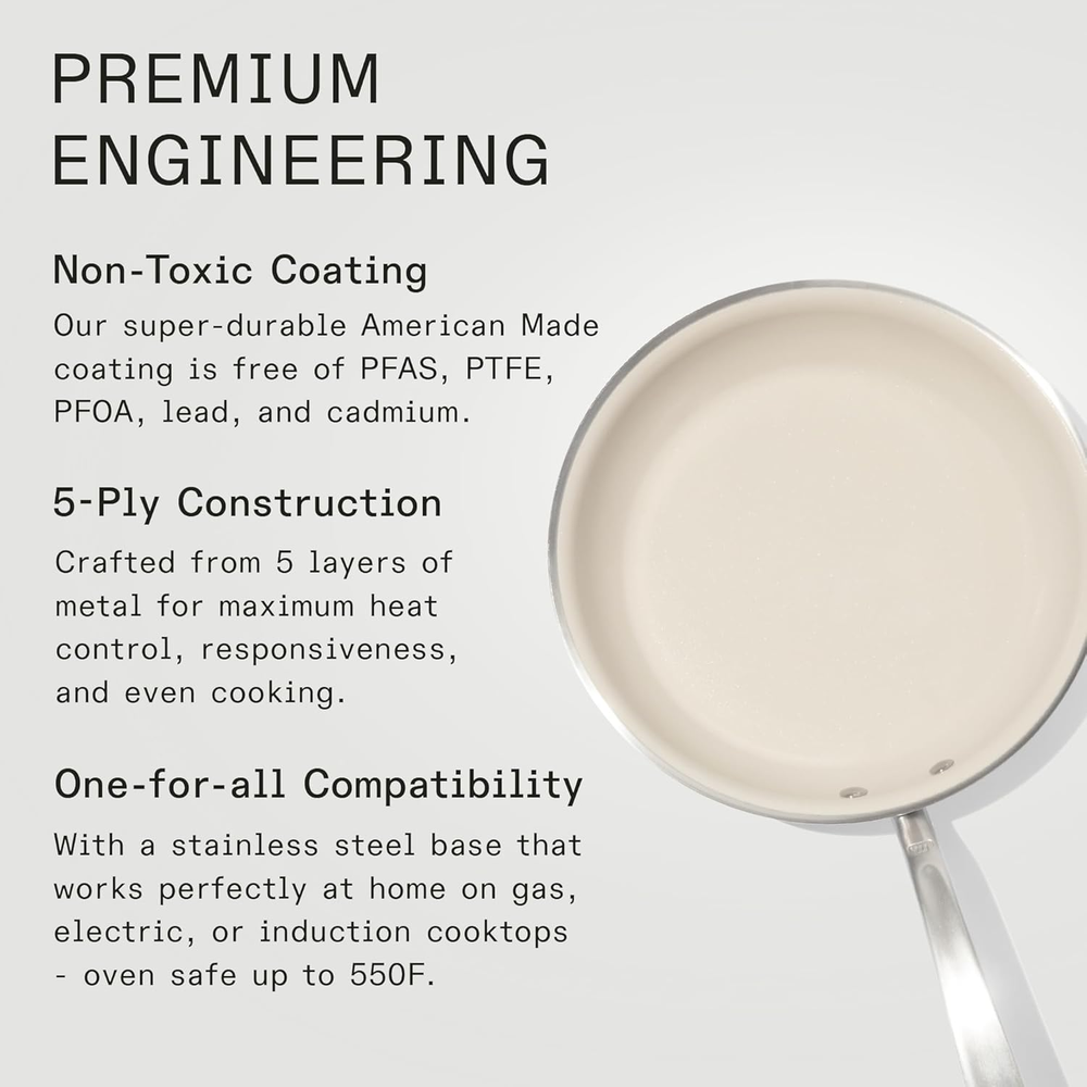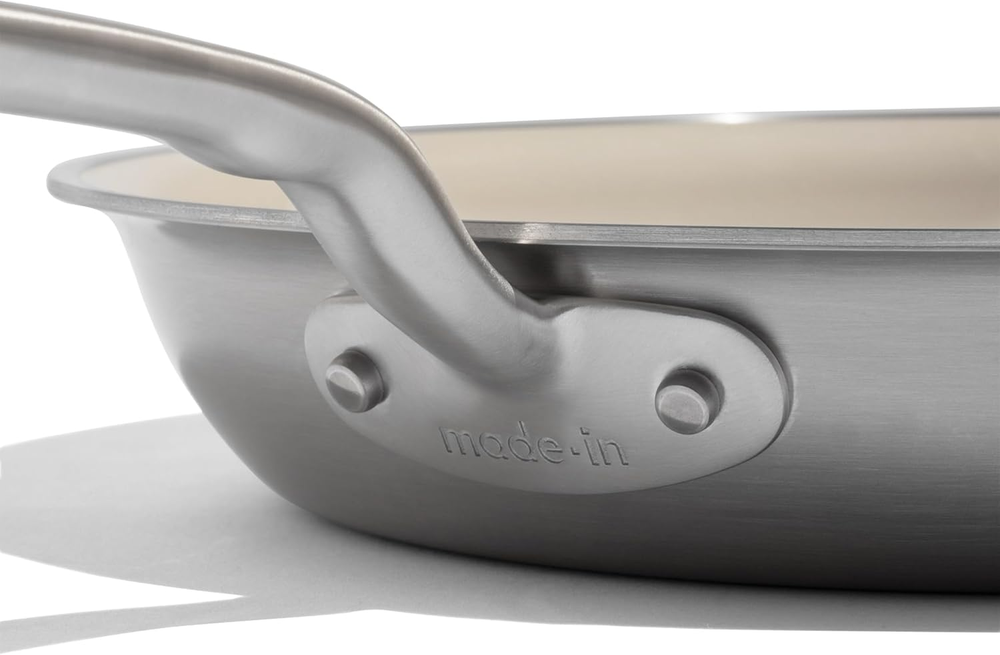 Total Diameter: 10.5 | Cooking Surface Diameter: 7.5 | Height (with handle): 3.25” | Depth: 1.75” | Length (with handle): 19.25” High-Performance Ceramic Coating - Our super-durable ceramic coating is free of PFAS, PTFE, PFOA, lead, and cadmium Premium 5-Ply, Cladded Construction - Each pan is crafted from 5 layers of metal, giving you maximum heat control, responsiveness, and even cooking capabilities Oven Safe - Safe for oven use up to 550F Induction Compatible - Compatible with all stovetops (including induction), each piece is an incredibly versatile addition to your cookware arsenal Made in the USA with Imported Components - Proudly crafted from premium metals to ensure you receive professional quality cookware Product Description The video showcases the product in use. The video guides you through product setup. The video compares multiple products. The video shows the product being unpacked. Behind the Material - CeramiClad Merchant Video Trusted by the World's Finest Chefs Add to Cart Add to Cart Add to Cart Add to Cart Customer Reviews 3.8 out of 5 stars 303 3.8 out of 5 stars 303 3.8 out of 5 stars 303 3.8 out of 5 stars 303 4.6 out of 5 stars 38 5.0 out of 5 stars 44 4.9 out of 5 stars 30 Price — — $149.00 $ 149 . 00 — $189.00 $ 189 . 00 $199.00 $ 199 . 00 $279.00 $ 279 . 00 Manufacturer Made In Cookware Made In Cookware Made In Cookware Made In Cookware Made In Cookware Made In Cookware Made In Cookware Material 5-Ply Stainless Steel 5-Ply Stainless Steel 5-Ply Stainless Steel 5-Ply Stainless Steel 5-Ply Stainless Steel 5-Ply Stainless Steel 5-Ply Stainless Steel Has Non Stick Coating ✔ ✔ ✔ ✔ ✔ ✔ ✔ Oven Safe ✔ ✔ ✔ ✔ ✔ ✔ ✔ Crafted in USA ✔ ✔ ✔ ✔ ✔ ✔ ✔
