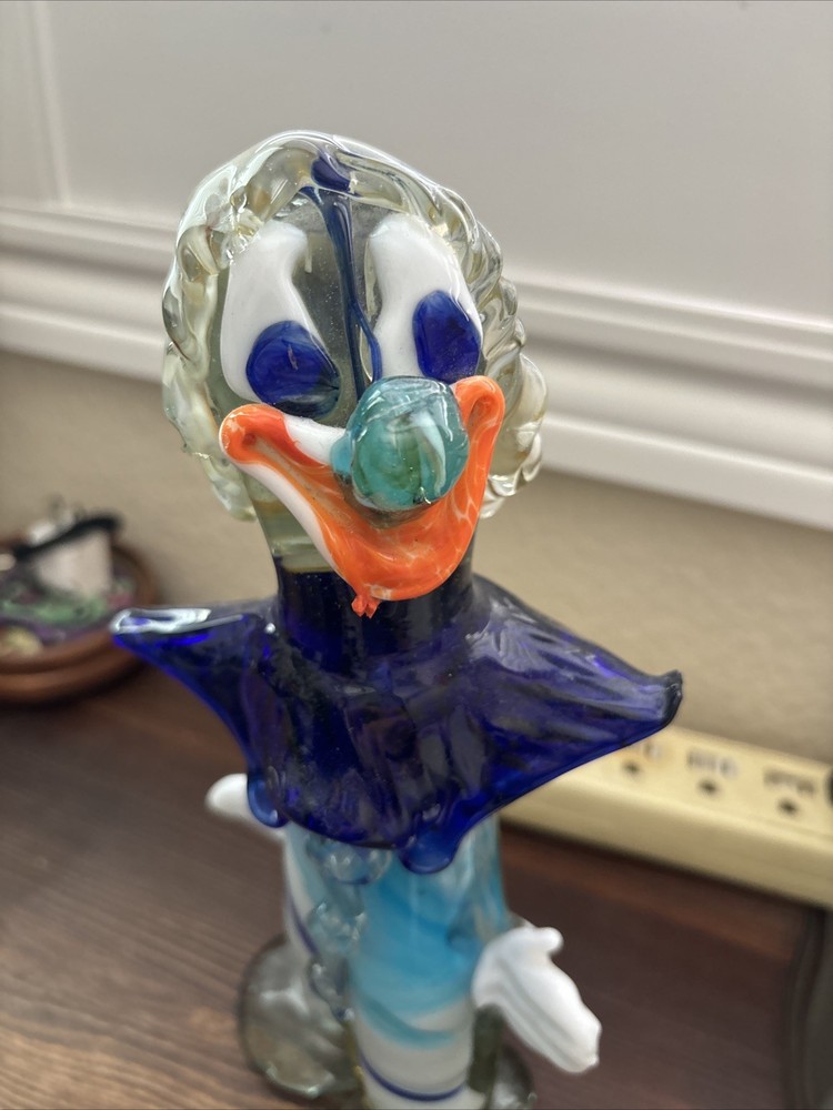 White hair Blue eyes Orange smile Blue tie Elevate your space with a touch of whimsy with this hand-blown glass clown figurine. Standing at an eye-catching 10 inches tall, it features vibrant multicolored hues complemented by a glossy finish, which captures the light to highlight its intricate details. Its striking blue eyes and friendly orange smile bring a playful yet endearing charm to any room. Crafted with meticulous care, this decorative piece hails from a tradition of art glass excellence, and as a vintage original, it carries the essence of a bygone era. The figurine's high-quality glass material and handmade origin assure you of a unique treasure that's both visually engaging and a testament to artisanal skill.