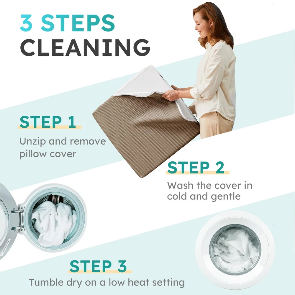 Wedge Pillow for Sleeping, Bed Wedge Pillow, Body Pillow for Back Support, Leg Elevation, Gerd Acid Reflux, Neck Pain, Snoring, Triangle Pillow Wedge - Cooling Memory Foam Top, Removable Washable Cover Versatile wedge pillow design provides superior comfort and support for sleeping, reading, sitting up in bed Features cooling gel-infused memory foam top layer and high-density premium foam base for comfort and support Breathable, removable and machine washable cover allows airflow and easy cleaning Built-in pockets to store items; Portable handle for easy transport. Upgraded foam meets CertiPUR-US and Oeko-Tex standards for durability and safety