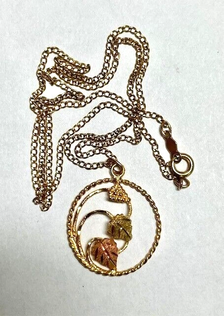 10K Black Hills Gold Round Pendant with a leaf design. The pendant is 3/4" in diameter and is Stamped 10K. This pendant comes with a 16" curb chain which is probably not original to this pendant. It is marked 1/20 12K which means it is gold filled. Preowned, used, in very good vintage condition as described. Age and origin are unknown to me. Description details: Please use the pictures as your main source of reference but contact me prior to bidding if you have questions. These are u sed and vintage items that may show appropriate age, wear and imperfections which I will describe in words and pictures: p lease inspect the pictures carefully prior to placing a bid. Items are sold "as is" with no warranty of any kind. Any coin showed in a picture is for scale only and is not included in the sale. Shipping: I ship to the US only via USPS Ground Advantage which includes Delivery Confirmation. Shipping will only be made to the buyer's confirmed US address. I do not ship internationally or to third parties. I will do my best to ship items within 2 business days after payment is received Monday through Friday. I cannot control the delivery time of the US Postal Service. Payment: I require payment through PayPal. Payment is due within 3 days unless prior arrangements are made. No returns unless the item is accidently misrepresented. Thanks for looking and happy holiday shopping!