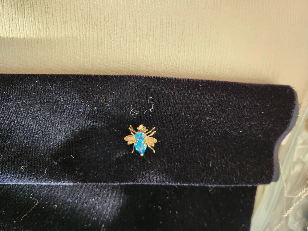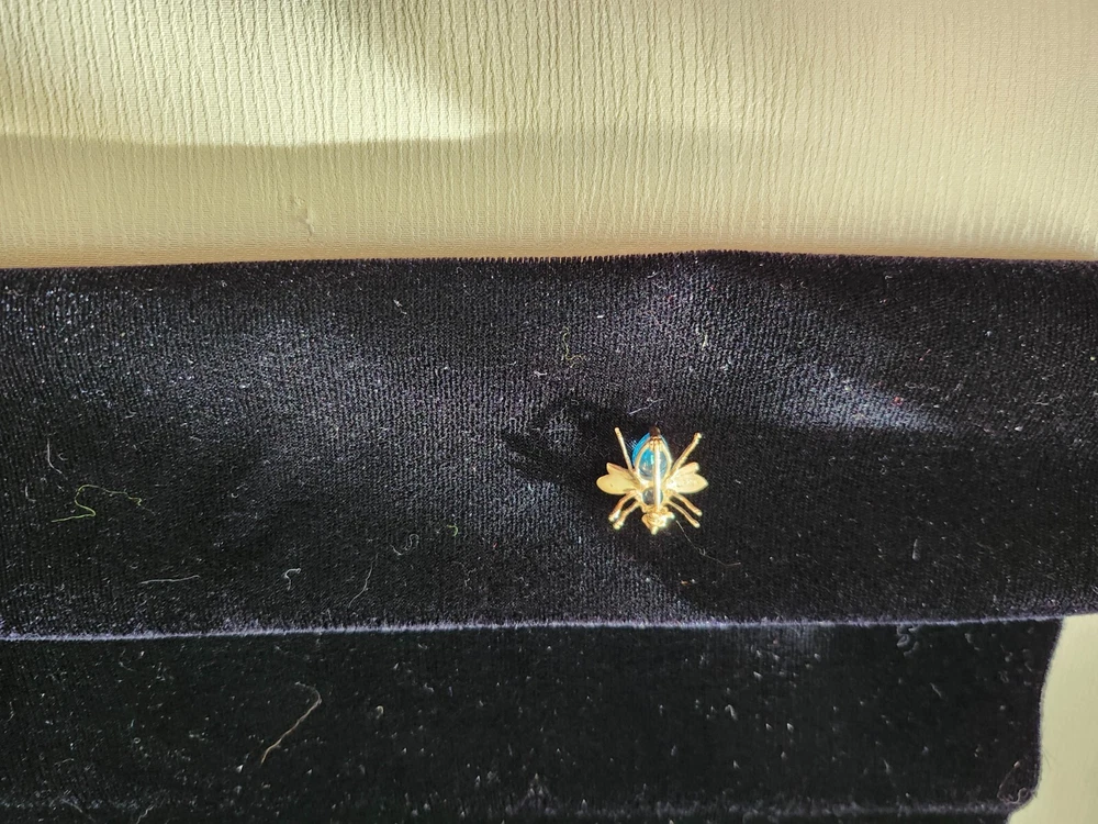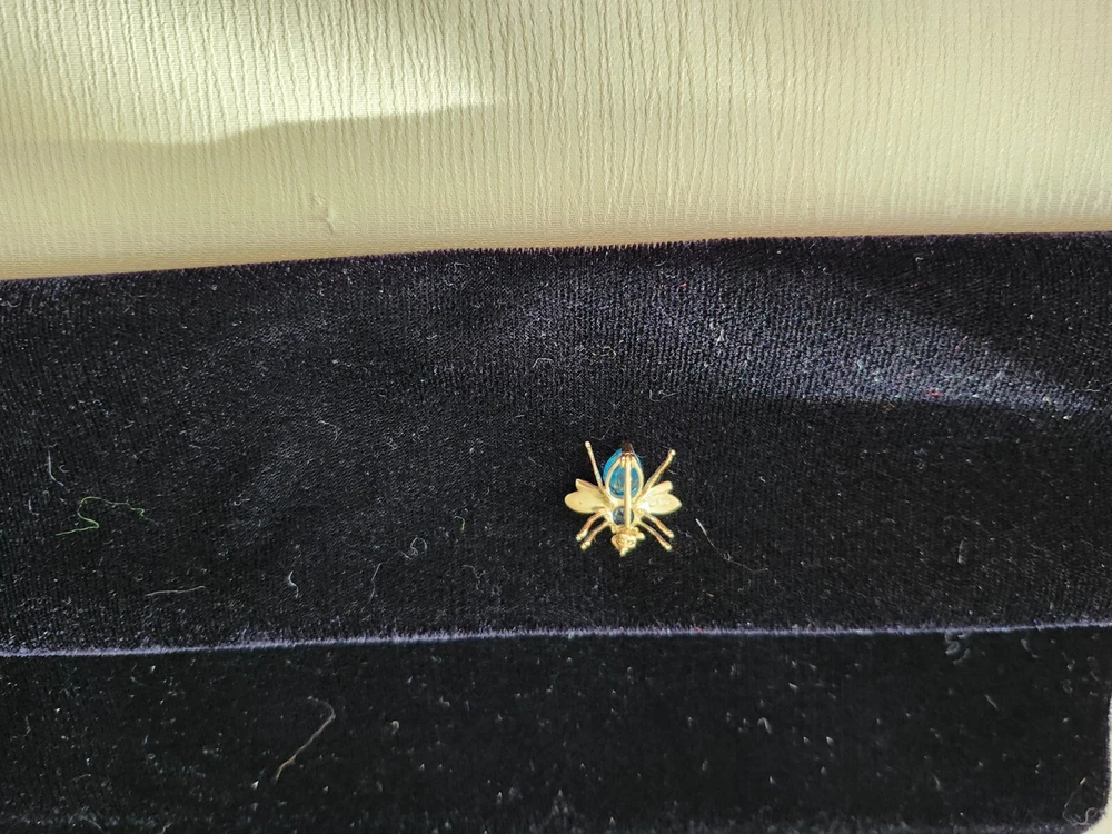 The product is a 10K yellow gold bug pin or brooch with blue sapphire eyes. This insect-style piece of fine jewelry features a vibrant blue color scheme, with the blue sapphire stones adding a touch of elegance and charm to the design. The use of yellow gold as the base metal further enhances the luxury appeal of this unique and eye-catching accessory.