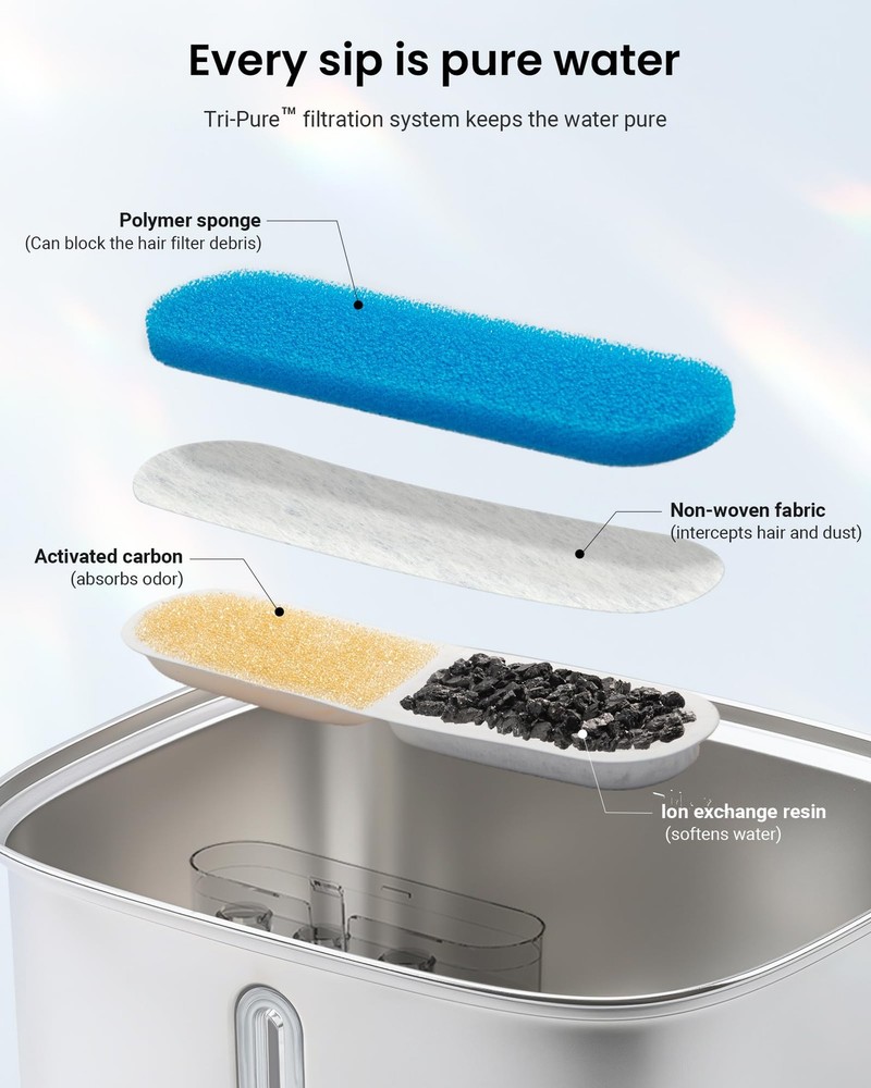 Product information Product Name: Smart Pet Water Fountain Product Material: 304 Stainless Steel + ABS Maximum Capacity: 10L/338 Oz Packaging Weight: 4.52 Pounds Packaging Size: 342*290*165mm Input Voltage: 100-240V, 50/60Hz Output Voltage: 5.0V/1.0A Filter Material: Filter Cotton + Activated Carbon + Ion Exchange Resin Filter element cycle:l month 10L Large Capacity & Smart APP Control: Stay Informed, Anywhere. Made with 304 food-grade stainless steel, this large dog fountain water bowl requires less refilling. Use the app to monitor water status, control InfraFlow mode or Interval mode remotely, and receive real-time hydration alerts for your pet. Advanced Safety with PumpFree Tech: PumeFree, No Burn Risk.The water-electricity separation design ensures pet safety. When the automatic dog water dispenser runs dry, power shuts off automatically to prevent overheating by the Anti-Dry Guard. A 360°visible window lets you easily check the water level. Tri-Pure Multi-Layer Filtration: Every Sip Is Fresh and Clean. The large dog water fountain equipped with sponge, non-woven fabric, activated carbon, and ion exchange resin layers, this large cat water fountain stainless steel filters out hair, dust, and impurities for safe, clean water every time. 3-Step Quick Clean Design: Easy Maintenance, Less Hassle. Easily disassemble the pump, filter box, and filter for hand washing. No tools needed. Note: Wipe the dog water bowl pump instead of rinsing directly to maintain performance. Dual Power Supply: Plug-In or Battery Backup for Peace of Mind in indoor and outdoor scene. Use plug-in mode for daily use and switch to battery mode (up to 30 days standby) during outages. The dog water fountain for large dogs WiFi auto-disables below 35% battery to save power - ensuring your pet always has access to water. Quiet Operation & Dedicated Support: Sleep Soundly, Worry-Free. This pet fountain keeps your home peaceful. Plus, enjoy responsive support from our expert team for any product inquiries. All-In-One Accessory Kit: Includes dog water dispenser*1, charging cable set*1, user manual*1, filter set *1 and cleaning brush*1—ready to use right out of the box.
