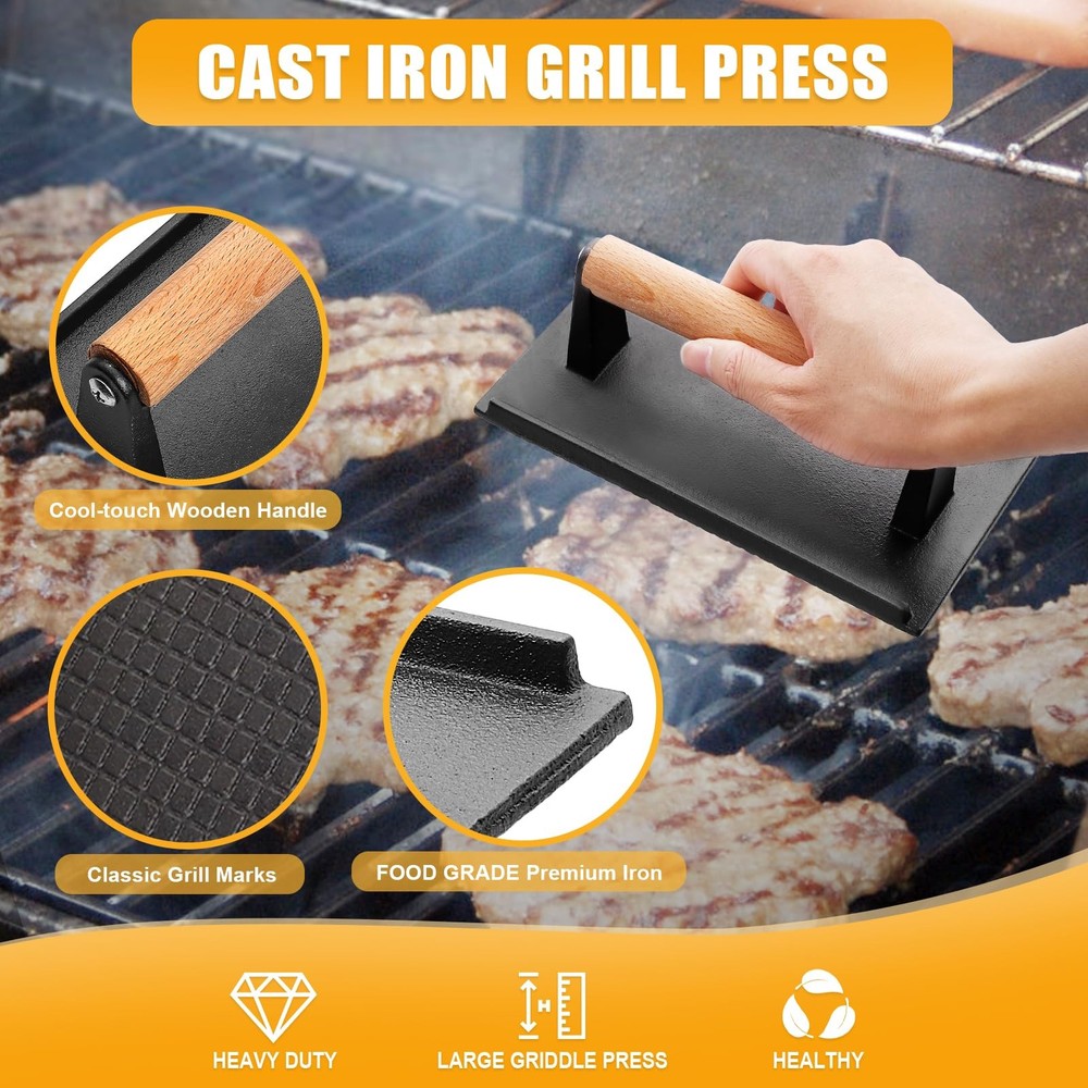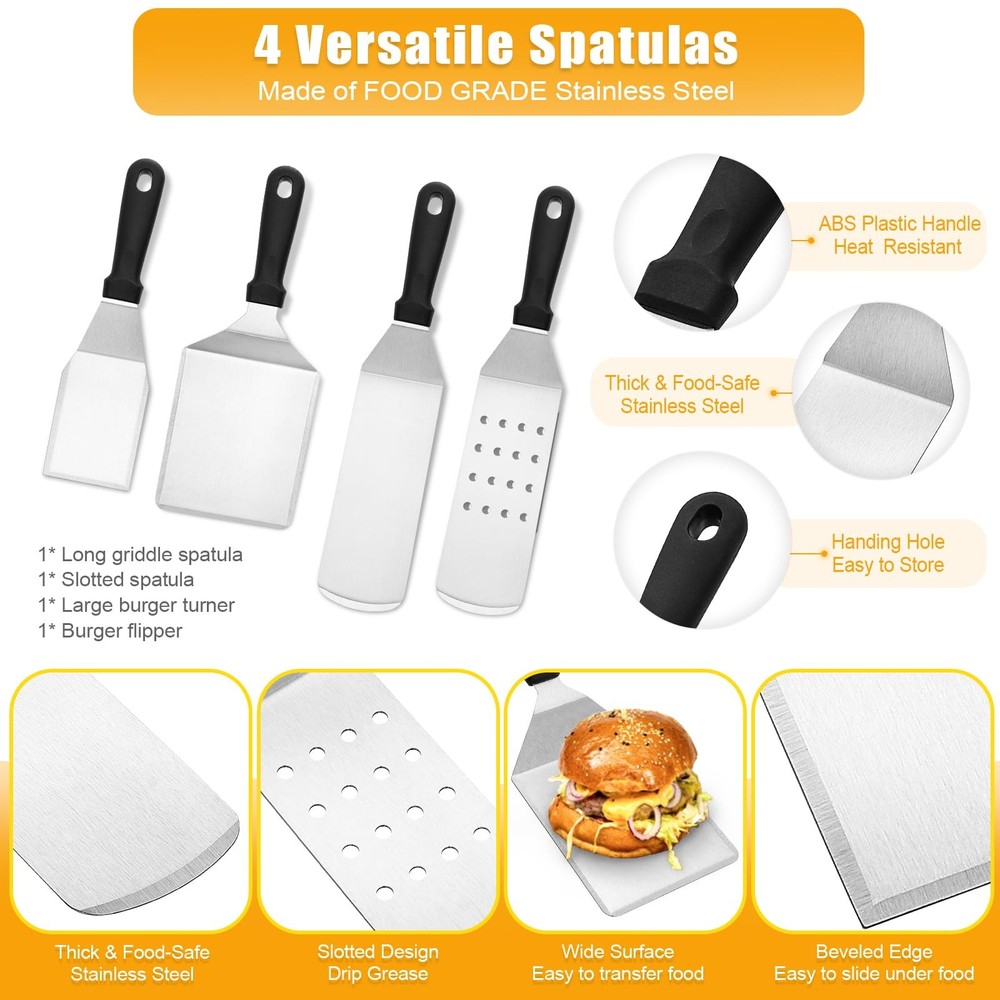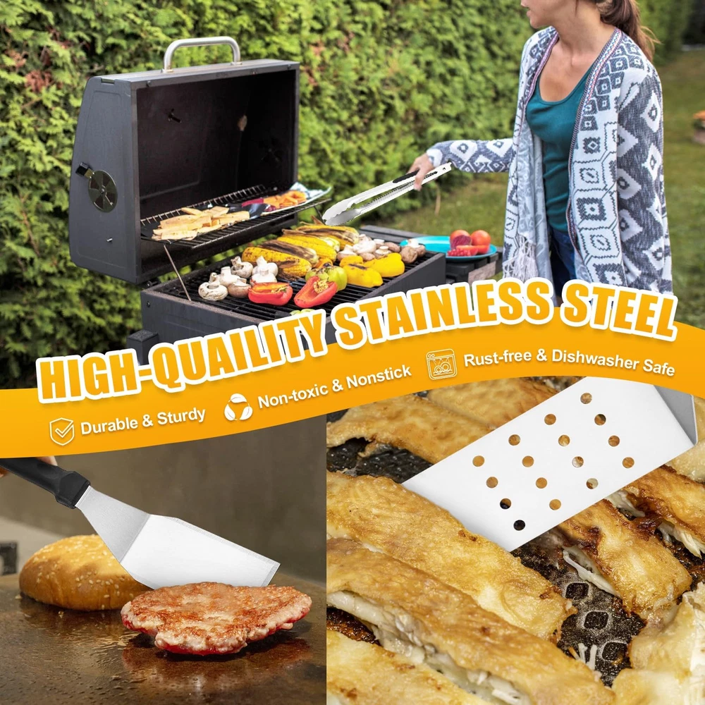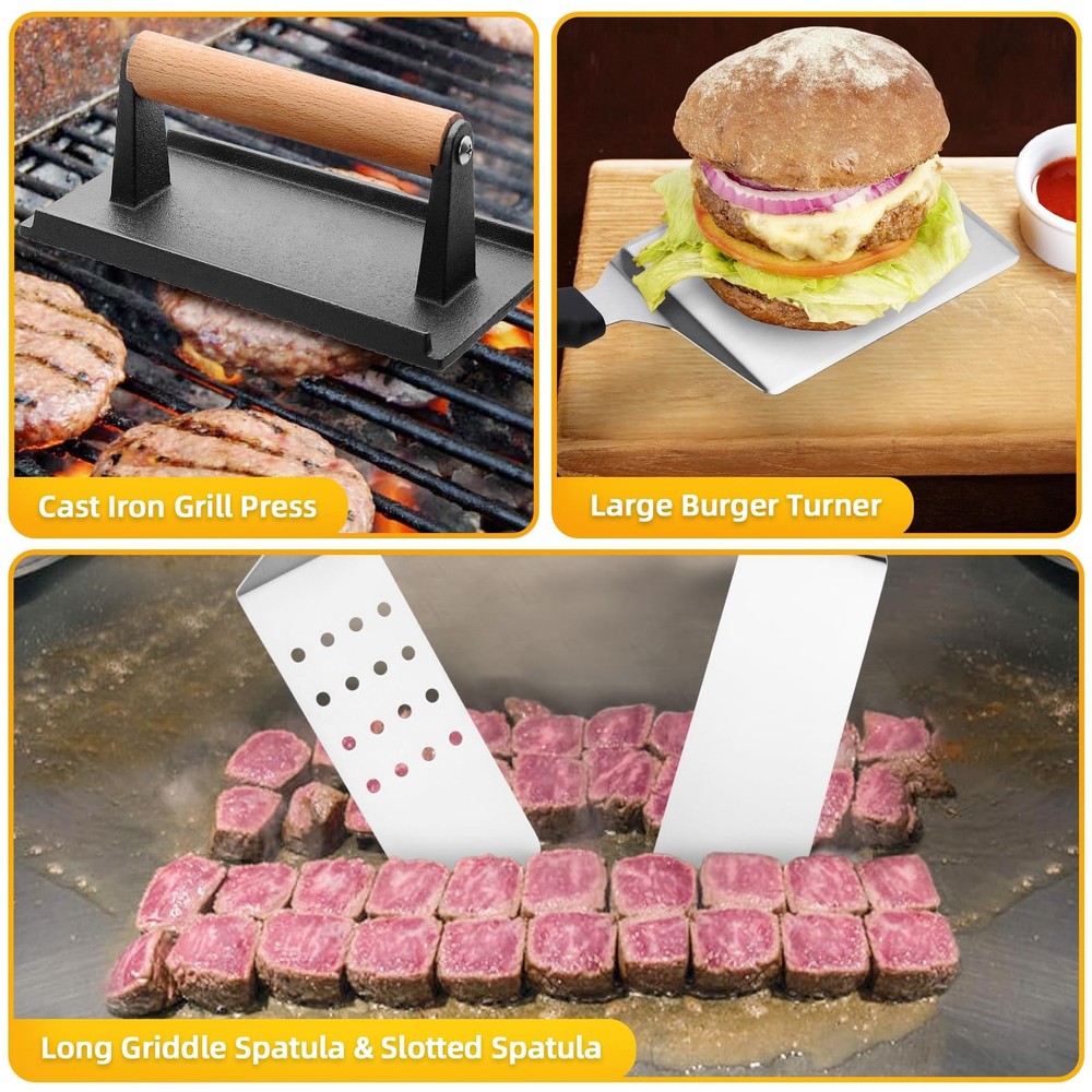 This griddle accessory set is a game-changer for outdoor cooking! The high-quality tools make flipping burgers, scraping the grill, and pressing meats effortless. The long spatula provides excellent reach, and the heavy-duty press ensures perfectly seared food every time. I love the included storage bag—it keeps everything organized for camping trips or backyard BBQs. The sauce bottles are a nice bonus for easy basting. Durable, well-designed, and worth every penny for serious grill masters or casual cooks. Makes cleanup a breeze and elevates my BBQ game!
