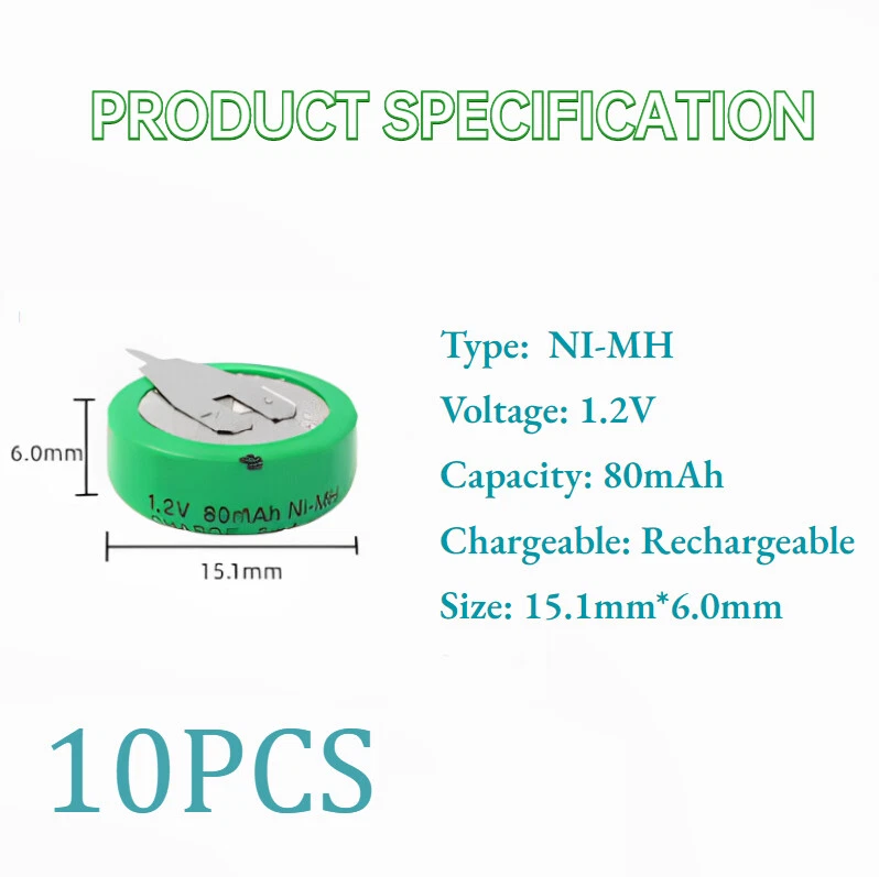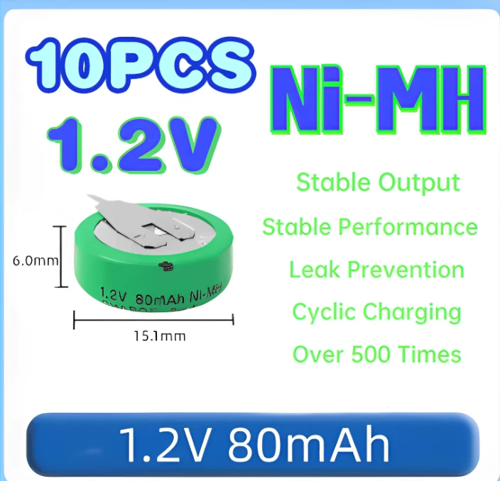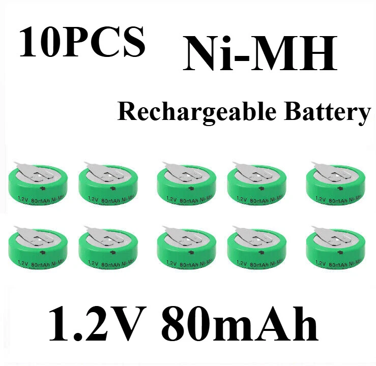 10PCS Rechargeable Ni-MH Battery 1.2V 80mAH With 2 Pins/Tabs For Meter Devices