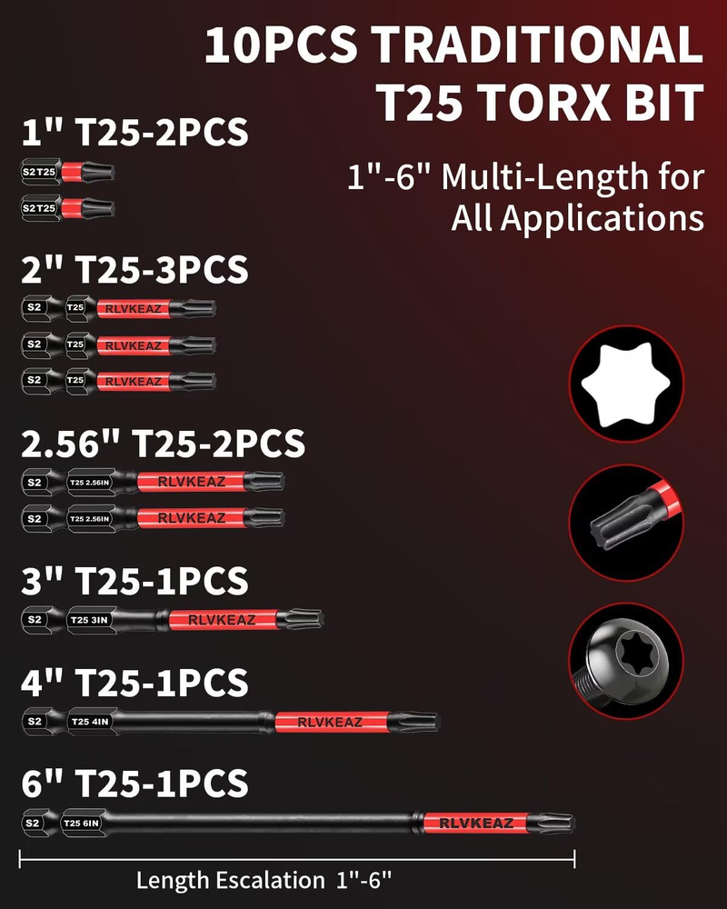 10-PCS T25 Torx Bit Set for Impact Driver - 1 to 6 Inch Lengths