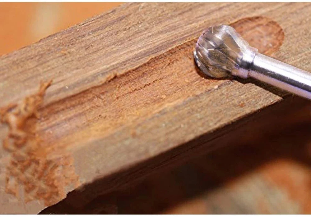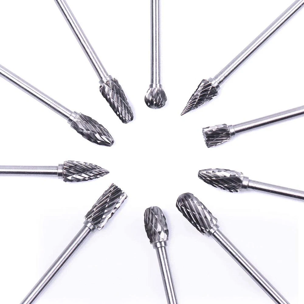 Tungsten Carbide Rotary Burr 10pcs Carving Burr Bits Double Diamond Cut Dremel Tools for Wood Stone Carving Steel Metal Working Product Highlights: 【CARBIDE DIE GRINDER BITS】: These carbide rotary burr set, with 1/8'' shank is made from Tungsten Carbide. Total Length:45-50mm, Cutting Diameter 1/4'', Shank Length 35mm, Shank Diameter 1/8''. 【DOUBLE CUT DESIGN】: The groove lines of these carbide rotary burr's head are crossed, which makes it more suitable for materials with relatively low density, such as wooden, plastic and aluminum. 【ADAPTABILITY】: 1/8” shank fits dremel and most small rotary tools with three jaw chuck for accurate centering. An ideal choice for your DIY woodworking, carving, engraving, and polishing. 【LONG WORKING LIFE】: Packed with plastic storage case for safety storage and protection. The working life of these solid rotary burr is 10 times longer than high-speed steel and 200 times longer than grinding wheel.