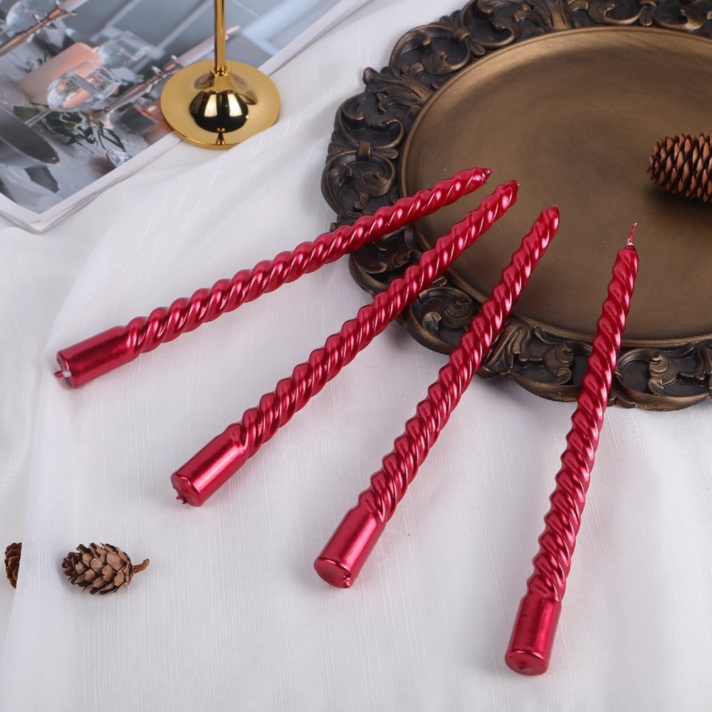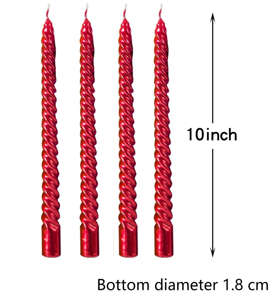 Wrcevtor 10 inch Taper Candles Set of 4 |7.5 hrs Clean Burning Unscented, for Wedding, Parties,Home Decor and Special Occasions,Long Candle Sticks, Spiral Candle Christmas Candles (10 INCH, Red) 10 INCH Taper Candles: 10 INCH 4 count Long candle. 100% pure cotton lead-free wick. These candles provide a great home décor option, perfect for party lite candles .dinner, parties, weddings, Halloween, and churches SIZE OF Tapered Candles :10 inch /25cm in length, approx 0.8inch/2cm in diameter of bottom.7.5-8Hour Burn Time. With 3/4" Base, they fit most candlesticks and candelabras Spice up the romance with a candlelit dinner with your loved one Novelty candles: safe and non-toxic. Eelegant and sturdy, burn for a long time . These candles are perfect for multiple occasions, from dinner parties to weddings Party candle:These candles can be used in birthday party or other special event. elegant design and are suitable for restaurants, special events and parties. A variety of color set options to meet your different needs, such as birthday candles, party candles, halloween candles, wedding candles, dinner candles, , Party candle, chime candles, spell candles Always gives priority to customer satisfaction:If for any reason you are unsatisfied with the quality of our candles, feel free to contact us, and we'll make things right Shipping We offer FREE shipping on all orders! We ship within Three business days of payment, usually sooner. We use a selection of shipping services such as UPS, FedEx, USPS etc. We only ship to the lower 48 states, no APO/FPO addresses or PO Boxes allowed. Local pickups and combined shipping options are not provided at this time. International buyers – please note: Import duties, taxes, and charges aren't included in the item price or postage cost. These charges are the buyer's responsibility. Please check with your country's customs office to determine what these additional costs will be prior to bidding or buying. Order Cancellation Policy * Order Cancellation Policy ** You can return a product for up to 30 days from the date you purchased it. 1. The seller reserves the right to cancel the special case only due to eBay cancellation fee. 2. The decision of seller is the final. 3. The seller will respond to the cancellation request within 2 business days. Please wait for the result of cancellation. 4. In case the cancellation is not completed by some reasons, the buyer can follow the options below to get the refund. 4.1 The buyer can reject the item when it arrives. 4.2 The buyer can send the item back to the seller within 30 days If the buyer receives item (USA Shipment ONLY). The seller will provide the FREE return label to the buyer when the buyer opens " Return Item" case on eBay by using the reason as "Change my mind" ONLY. 5. When buyer has placed the order. The order will be processed and completed by automatic warehouse system within 5 minutes. In case that buyer sends the cancellation request after 5 minutes of placing the order, the request will be rejected. **Sending direct message to cancel the order is not allowed for every case.* Return Policy - If buyer would like to return the items for refund or replacement, please CONTACT SELLER to receive the free return label from seller. The refund or replacement will be processed with the tracking number of return label which is provided by seller only. The other ways of return which are not approved by seller will not be processed for the refund or replacement. Return You can return a product for up to 30 days from the date you purchased it. Any product you return must be in the same condition you received it and in the original packaging. Please keep the receipt. Payment We accept payment by any of the following methods: eBay Payments Please pay as soon as possible after winning an auction, as that will allow us to post your item to you sooner! Feedback Customer satisfaction is very important to us. If you have any problem with your order, please contact us and we will do our best to make you satisfied. Contact Us If you have any queries, please contact us via ebay. We usually respond within 24 hours on weekdays. Please visit our eBay store to check out other items for sale! Thank you for shopping at our store.