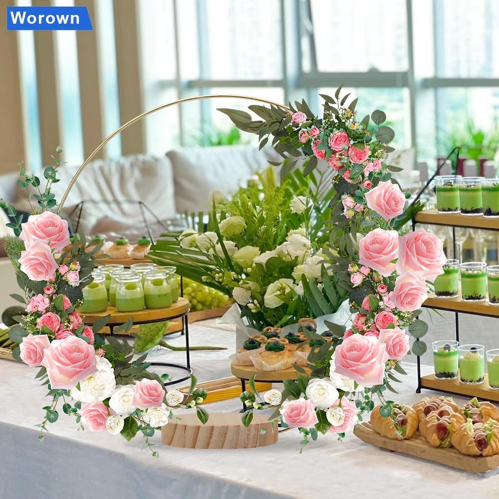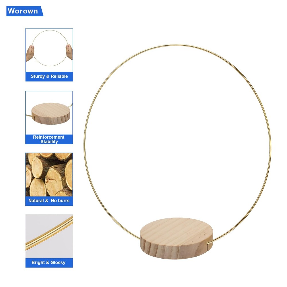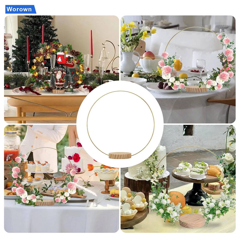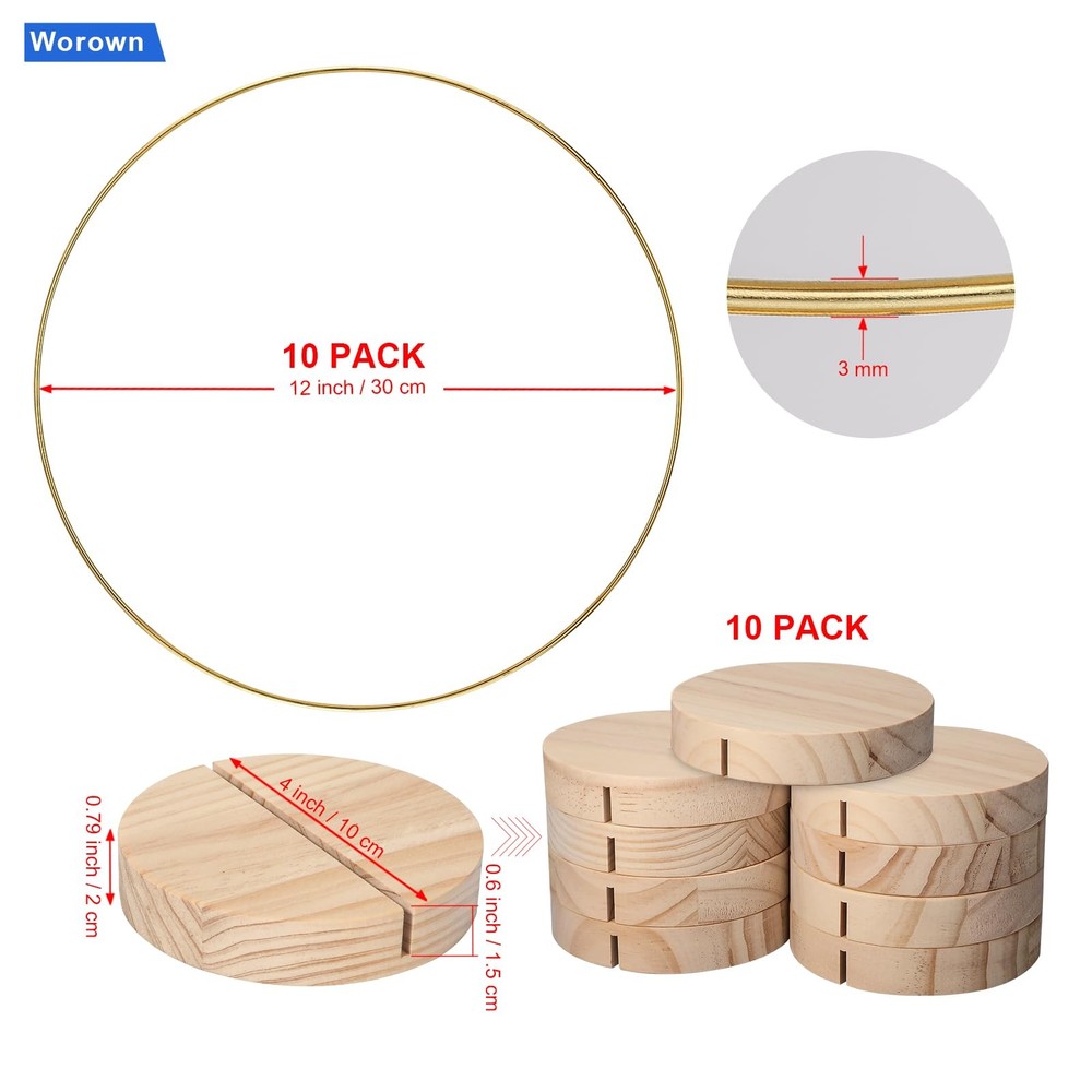 10 Pack 12 Inch Floral Hoops Table Centerpiece, Metal Wreath Ring with Wood Stand, Gold Hoop Centerpieces, Including 10 Pcs Wooden Round Base for Making Wedding Table Wreath Decor, Wall Hanging Wreaths and Crafts Package includes: 10 pieces 12 inch gold metal wreath rings with 10 pieces wooden round base ( ∅4 inch x 0.8 inch) Materials: Superior metal with glossy, natural radiata pine wood Applications: DIY wedding table centerpiece decoration, innovate your unique wedding ambiance, foster a memorable experience DIY wall hanging crafts, exhibit a salient sense of familial warmth DIY Christmas hoops, Halloween wreath, birthday wreath and various holiday wreath adornments DIY table decorations for any formal or informal event, underscore the artistic and sophisticated atmosphere Package includes: 10 pieces 12 inches gold metal wreath rings, and 10 natural wooden round bases in perfect packaging Measurement & Features: The approx diameter of the floral hoop is 12 inch, with a thickness of 3 mm. The wooden round holder features a stable measure design of ∅4 inch x 0.8 inch (thickness). The slot depth-15mm x width-3mm securely holds the metal ring, while the notch facing downward enhances aesthetics. It can accommodate aromatherapy, candles, or other ornaments for enhanced decorative effect Material: These floral hoops are constructed from strong and durable metal, the glazed surface ensures its anti-oxidation and anti-rust qualities. The round wooden base is fashioned from natural radiata pinewood with a polished surface, ensuring resilience against cracking and discoloration. Its surface texture creates an attractive aesthetic Extensive usage: Metallic hoops are optimal for creating floral wreaths, dream catchers, macrame crafts, plant hangers, and numerous other artworks. Well-paired with wooden stands, they're effective for wedding table decor, restaurant centerpieces, and various party centerpieces. The hoops are also efficient for creating wall hanging artworks, promising an appealing accent piece for homes and offices. The wooden stand is suitable for creating table numbers, card holders, and displaying photos Adaptable to various materials: Metal floral hoops accommodate cotton, fabrics, curtains, ribbons, among other materials, for crafting exquisite pieces. These distinctive handmade pieces are ideal for restaurant decorations, candy stores, events, weddings, and gift-giving