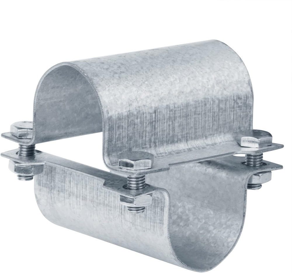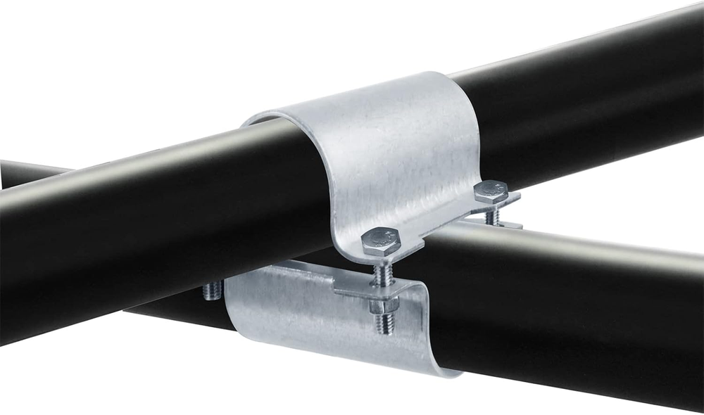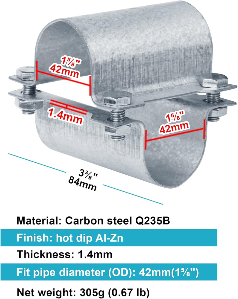 Carbon Steel Q235B hot dip Al-Zn finish ,Fit pipe OD diameter: 1-5/8" (42 mm) chain link fence pipe in or Nominal Size 1-1/4" (actual size:1.66") galvanized steel Pipe, with Bolts and Nuts Compressive strength: 205Mpa (500kg). Net weight: 175g (1 set) Greenhouse cross connectors are a way to construct your greenhouse structure, Pipes can be added or removed in place Product size: 86 x 84 x 84 mm,Thickness: 1.5mm, Slot hole diameter: 9 x 10.5mm, stainless steel bolt size: #8 x 11/16 in 10 set cross pipe connector, 20 pcs emicircle pipe clamps, used in pairs Product Description Application Fit for tube/pipe: (Rail) 42mm(1-5/8 inch), (Post) 42mm(1-5/8 inch ) Packing list 10 set cross pipe clamps Size information Thickness: 1.4mm Slot hole size 9x10.5mm Bolt size: #8 x 11/16 in stainless steel Product size: 86 x 84 x 84 mm . . Specification Material: Carbon steel Q235B surface treatment: hot dip Al-Zn Compressive strength: 205MPa(actually approach to 500kg) Package size: 13.5 x 7.5 x 7cm Weight: 305g per set clamp, 3260 for 10 set clamps