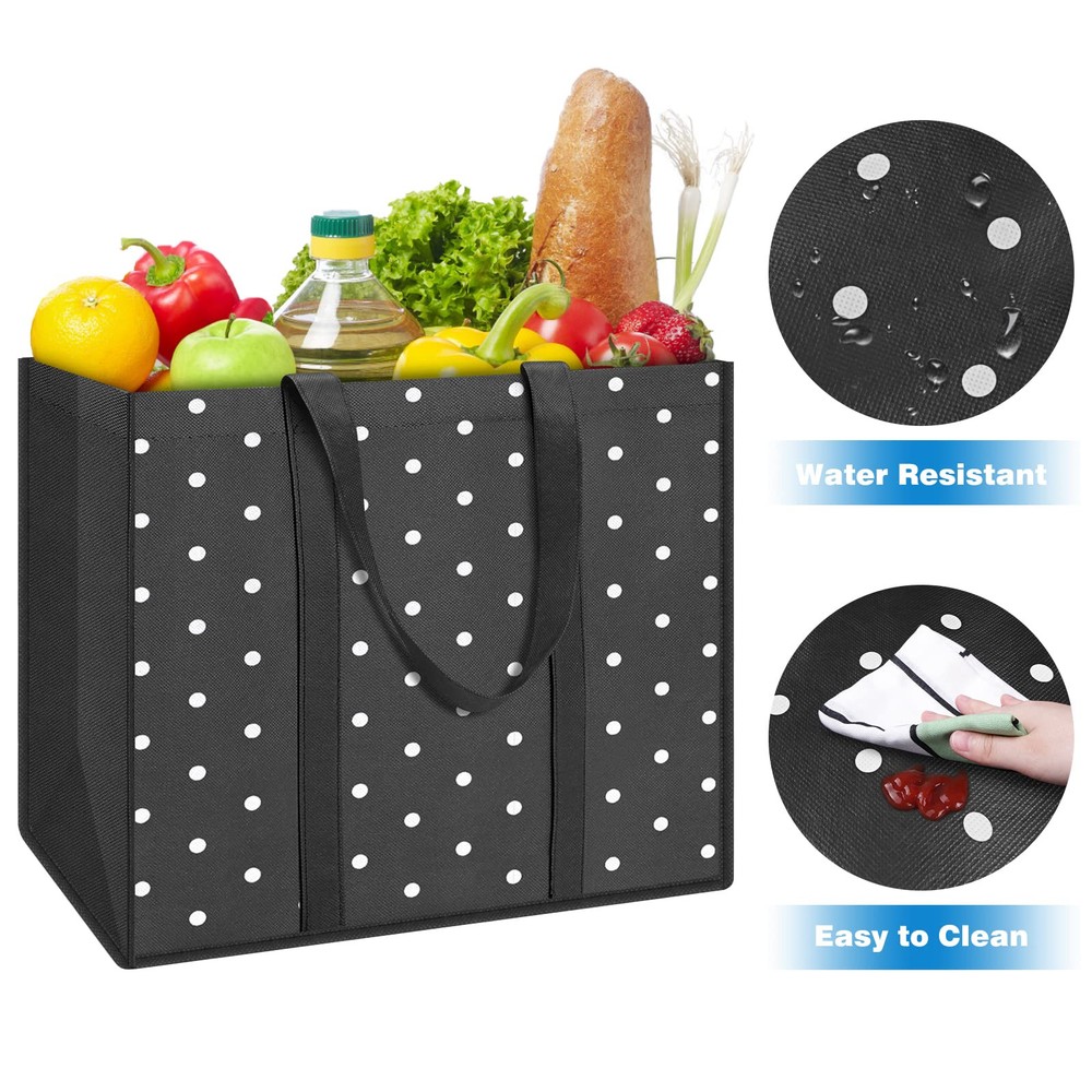 LARGE CAPACITY: each reusable grocery bag has a capacity of 35 L, ample enough to meet the needs for daily shopping and outdoor picnics; all grocery tote bags have extra reinforcement at the seams for durability and to hold heavy items WATERPROOF AND EASY CLEANING: the shopping bag is made of non-woven cloth with waterproof coating, which is waterproof and easy to clean; if there are stains on the surface of the reusable bag, simply wipe off with a wet paper towel LONG HANDLES AND STANDS UPRIGHT: the reusable shopping bags have long handles to carry over the shoulder while shopping; the unique upright design allows the grocery bag to retain its shape and stay open during use MULTI-USE: the reusable bags are useful for grocery trips and are handy for carrying snacks, toys, clothes, etc., when you have a short trip; on special occasions, such as Easter, Mother's Day, the shopping bags may also be used as reusable gift bags FASHIONABLE: reusable grocery shopping bags are made up of many different patterns with fashionable designs; Tote bags are made of recycled non-woven fabric to make high-quality, sustainable bags, which are a alternative to single-use plastic bags