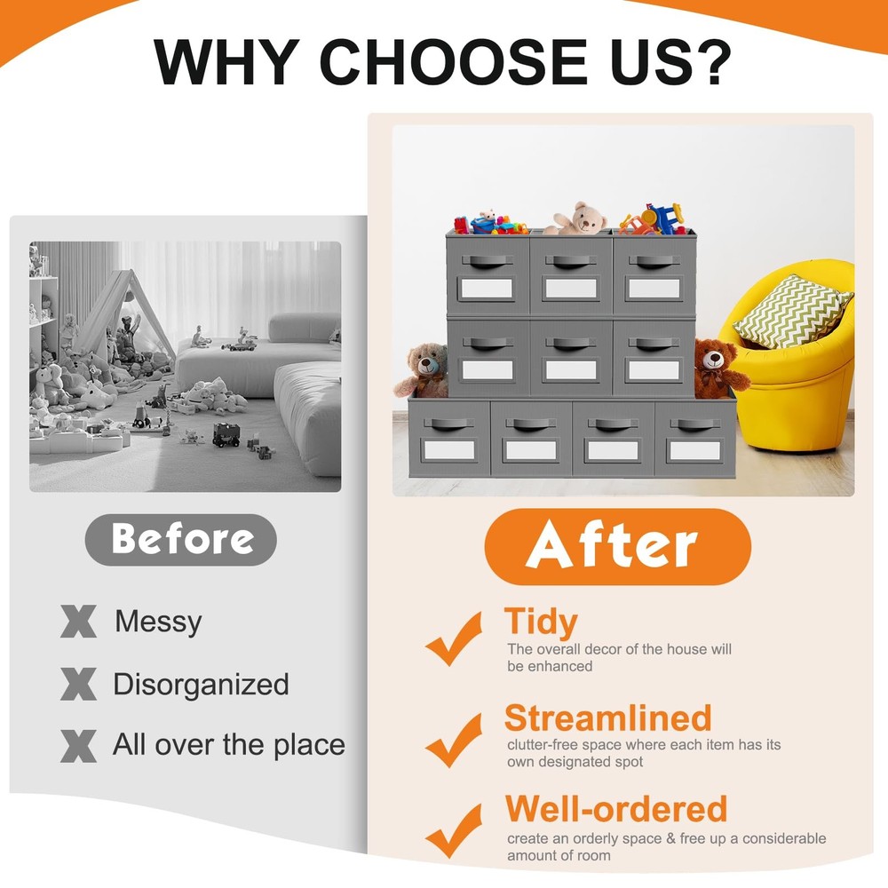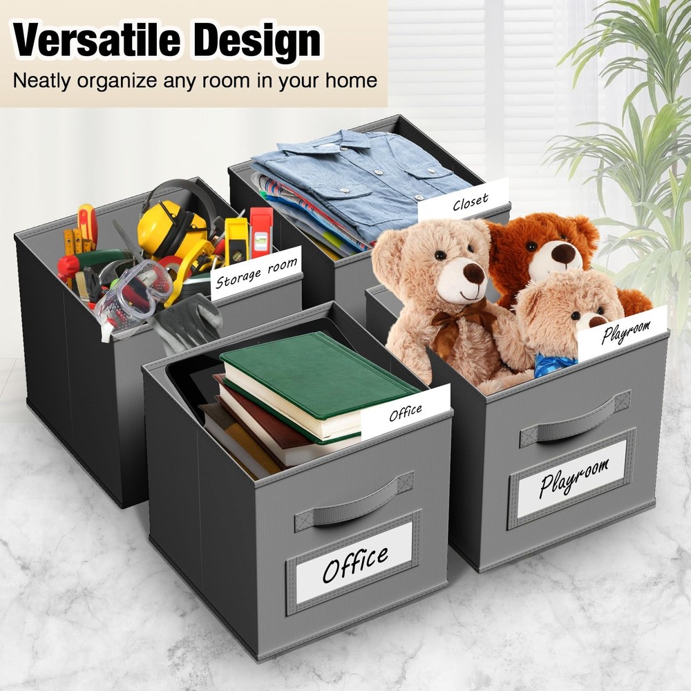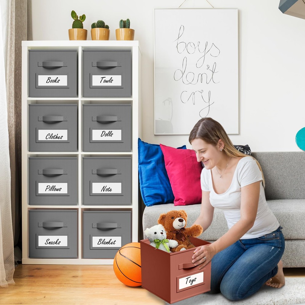 10 Pcs 11 Inch Fabric Storage Cubes with Labels Collapsible Organizer Baskets Description: Features: Sufficient Quantity: 10 Pcs cube storage organizer bins with reinforced handles are not only suitable for home use, but also for offices and dormitories to organize work supplies and daily necessities. Labels for Easy Classification: Each foldable storage cube is equipped with a transparent slot, you can put label cards to effectively classify different items, so that you can easily find what you need. Specifications: Material: non-woven fabrics Color: grey Size: 11 inches/ 27.5 x 27.5 x 27.5 cm Package includes: 10 x Storage cubes Notes: Manual measurement, please allow slight errors on size. The color may exist a slight difference due to different screen displays. Features: Dirt-resistant Color: you will get 10 PCS dirt resistant grey fabric cube storage organizers with label cards, they are 10½" L x 10½" W x 11" H, the proper size will fit in your cabinets, and blend in with room decor while keeping items orderly Label Window Design: our storage cubes are with label windows, it will help you categorize stuffs more efficiently, and easy for you find them quickly; These grey fabric cubes with handles, ensures a comfortable grip, which can be used as a drawer Foldable Design: these cube storage bins can be easily to assemble in 3 seconds, just insert base into the bin; And they can be folded when not in use, without occupying space and convenient to carry Wide Range of Uses: our grey fabric storage basket is excellent for clothes, art craft supplies, toys, books, seasonal items, holiday ornaments and other stuffs, They are widely used in shelf, Closet, bookcase, desk, play Room or Nursery, laundry area, storage room, shelving area, dorm, classroom or office Long Time Service: our foldable Rainbow style storage cubes are made of thicken nonwoven and cardboard, sturdy and durable, not easy to deform; They also may be a good choice for small dog and cat kennels SHIPPING We are always working hard to ensure your package arrives as soon as possible. Please understand that some factors like weather, high postal traffic, and the performance of shipping companies are outside of our control. We offer free shipping to the lower 48 states and ship within 3 business days of payment, usually sooner. We do not accept P.O. Boxes. Please provide a physical address.