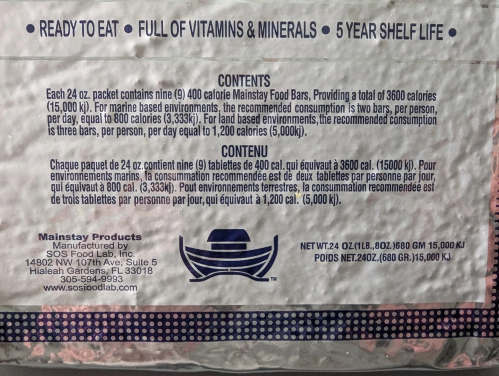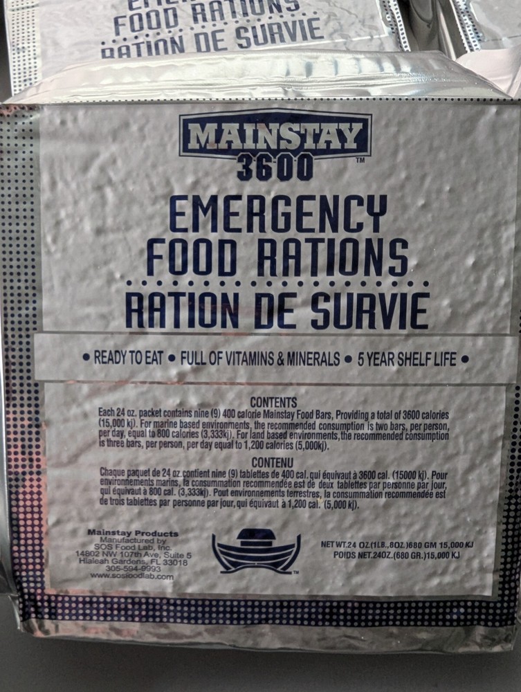 GREAT PRICE! Be prepared for any emergency with these Mainstay Emergency Food Rations. Each pack contains 3600 calorie bars made by SOS Food Lab, suitable for backpacking, hunting, camping, hiking, and other outdoor activities. The lightweight bars are easy to carry and can be eaten on the go, providing the necessary energy to survive. Weight is 1 pound 8 ounces Expiration date is 9/2026 Depending on the method we choose to ship it could be FED - EX, UPS or USPS the packs may not come in the original box we may put the 10 packs into another box to save on shipping.