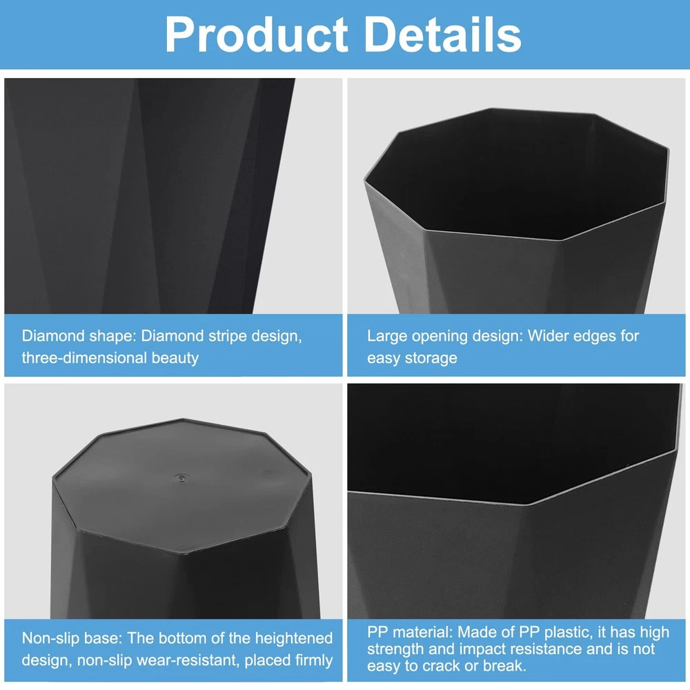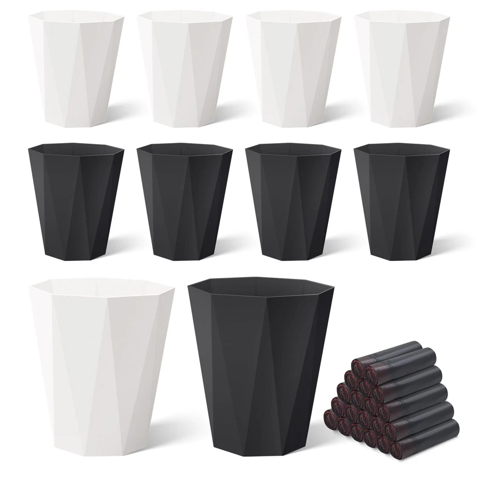 Size and Quantity: This small trash can has an upper diameter of 8.3 inches / 21 cm, a lower diameter of 5.4 inches / 13.6 cm, and a height of 9.4 inches / 24 cm, with a capacity of 1.8 gallons / 6.8 liters. The package includes a total of 10 trash cans, 5 in white and 5 in black, along with 375 counts/ 25rolls trash bags. Material: The bathroom trash can is made of PP plastic, which has high strength and impact resistance, can withstand a certain degree of physical impact, and is not easy to crack or break. Multi-Occasion Use: The bathroom garbage can is suitable for a variety of occasions, including bathrooms, bedrooms, kitchens, desks, dormitories and other occasions. Bring convenience to your daily life. Appearance: The round office trash can is diamond-shaped. This geometric pattern adds a visual sense of three-dimensionality and fashion, which is very suitable for modern and high-end interior decoration styles. It is not only practical, but also can be used as a decoration to add a fashionable element to the room. Tips: Before placing an order, please carefully check the specific size information of the product to ensure that it meets your needs. If you need a larger capacity trash can, please consider it carefully to avoid unnecessary returns and exchanges.