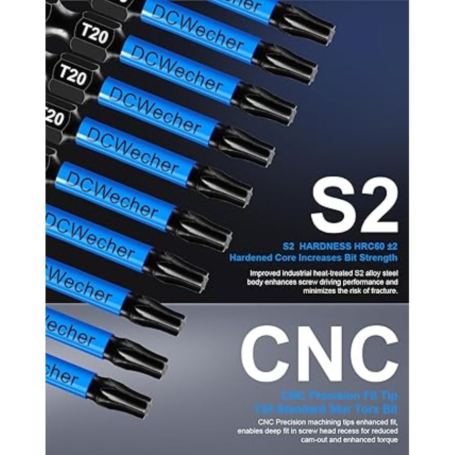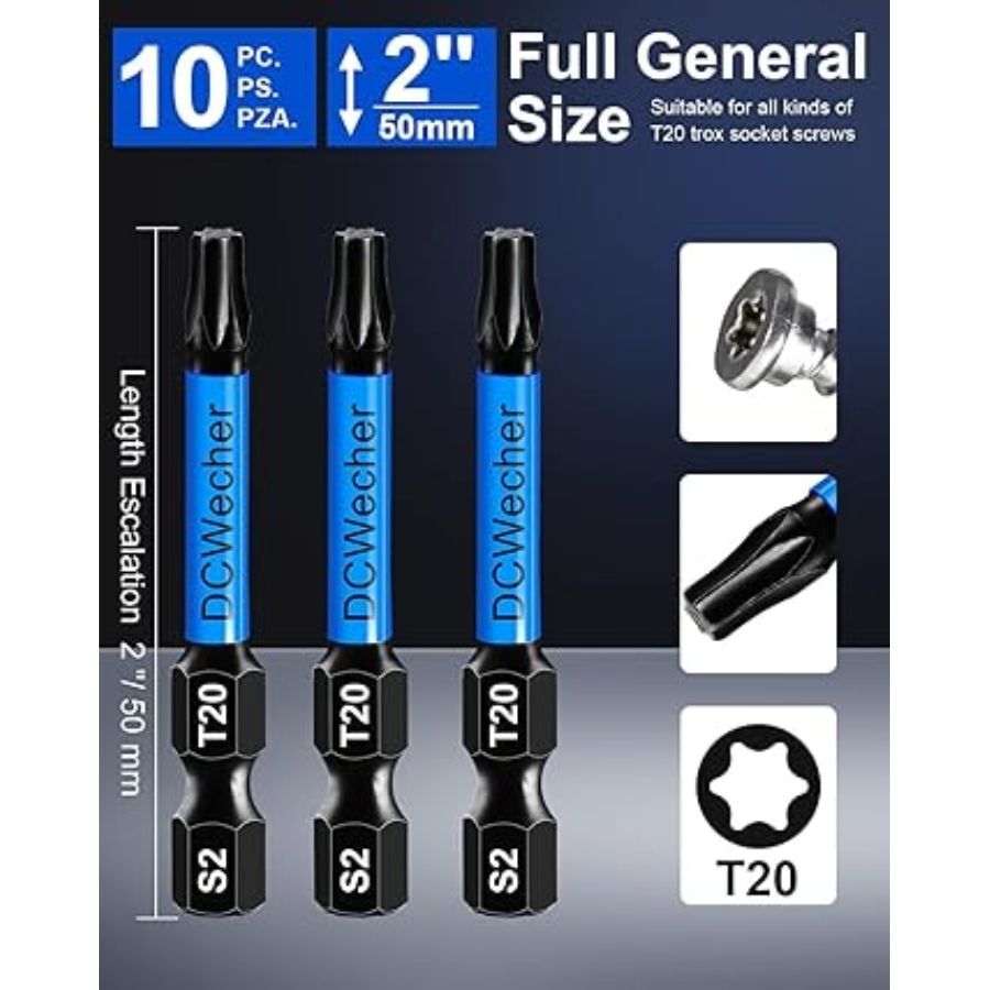 About this item [T20 STANDARD STAR TORX BIT] This 10-Pack of T20 torx bits measures 2 x 0.25 x 2 inches and weighs 3.21 ounces, with a bit holder. Each drill bit is clearly labeled with its size. [UPGRADED INDUSTRIAL STRENGTH MATERIAL] T20 Torx bits are made of solid S2 steel alloy with a hardness grade of 60 HRC, and have undergone an exquisite heat treatment process, making them suitable for standard drill bits or impact drivers. [MAGNETIC T20 BIT] The impact T20 torx bits feature sufficient magnetic strength to make locking and removing screws easy, and the magnetic capability does not decay after repeated use, with a 1/4" Hex-Shank for quick changes. [CNC PRECISION FIT TIP] These impact T20 torx bits enable a deep fit in screw head recesses, reducing cam-out and enhancing torque, effectively avoiding breakage. [SIZE] Each torx bit measures 2 x 0.25 x 2 inches and weighs 3.21 ounces.