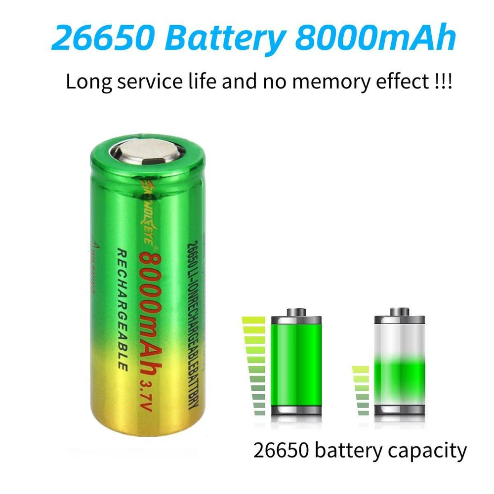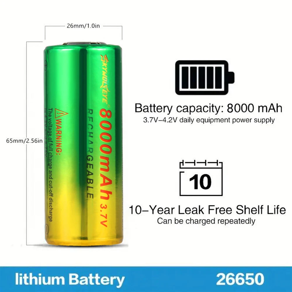 Lot 2-10Pcs 26650 3.7V Lithium Rechargeable Batteries 8000mAh for LED Flashlight Warm Tips: Before use, please remove the plastic packaging film of the battery. 26650 Battery Features: 1.【Rechargeable Battery Size】 The Size of the rechargeable batteries 26650 are: 67*26*26mm(2.64*1.02*1.02 inch). NOTE : Please confirm whether the battery size matches the device before purchase. 2.【High Performance】 3.7v 2￵6￵6￵5￵0 rechargeable battery with large capacity supports stable output voltage, effectively prevent damage of the devices, 26650 li-ion battery 3.7v is perfect replacement battery for used devices with high frequency. 3.【Multiple Protections】 This 2￵6￵6￵5￵0 lithium battery is without any memory effect and provide multiple protections,including short circuit, overcharge, and overcurrent protection. Prefectly make the 26650 rechargeable battery 3.7v to be more stable and safe to protect your devices. NOTE: Please use this 3.7V rechargeable battery in the proper way 4.【Warm Service】 All of 26650 batteries have passed strict testing for normal use. If you have any question, please feel free to contact us, we'll reply email ASAP. 26650 Battery Details: 1. Model: 26650 2. Type: Rechargeable Li-lithium battery 3. Battery Capacity:8000mAh 4. Voltage: 3.7V 5. Max Continuous Discharge: 8A 6. Max Discharge: 4A 7. Size: About 66*25*25mm 8. Color: Green Package included: Package 1: 10 x 26650 Battery 3.7V Lithium Rechargeable Package 2: 8 x 26650 Battery 3.7V Li thium Rechargeable Package 3: 6 x 26650 Battery 3.7V Li thium Rechargeable Package 4: 4 x 26650 Battery 3.7V Li thium Rechargeable Package 5: 2 x 26650 Battery 3.7V Li thium Rechargeable Warm Tips: 1. Before use, please remove the plastic packaging film of the battery. 2. Please check the "+" and "—" directions of the battery before you charge the battery. 3. Do not put the product into fire, short circuit, dissassemble and extrude. 4. Do not mix fresh batteries with used batteries, which may explode or leak, causing personal injury. 5. Please take out the battery if you won't use for a long time to avoid battery leakage. 7. Note:Please find us in first time when you find the parcel Broken/Scratch/Function Error/Miss Parts/Unwork/has not arrived etc, we always have more details and solutions, even duty for your order. On Feb 25, 2025 at 18:12:26 PST, seller added the following information: