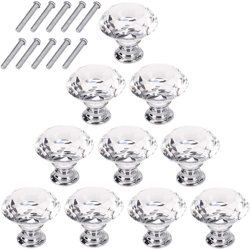 --MATERIAL: Clear cut crystal glass and alloy base, shiny polished chrome, glittering and sparking, diamond shape, good decoration for your home or office. --APPLICATION: Fit for cabinet dresser drawers cupboard wardrobe bookcase etc,give your furniture a sparkly new looking. --INSTALLION:Easy to install. Find the position where you want to install on the board and drill a hole , then pass through the screw from the back of board anf thread tight to the knob. Be careful during the work. --ATTENTION:Please use this knobs with the objects that thickness is not over 1 inch. --SIZE: Screw Thread Length:0.8 inch Height:1 inch Diameter: top 1.3 inches bottom:0.6 inch -The crystal knob is very pretty artistic and durable,ideal for installed cabinet,wardrobe,dresser,drawers,bathrooms,cupboard, bin,wardrobe,newborns room ,armoire,nightstand,large jewelry stand box/drawer hutch redo etc. -You will be surprised after you install it.They looks pretty,sparkly, gorgeous,stunning ,cute adorable feminine touch to any room,Children and ladies at home will be happy it,when the sun shines in the room, they throw prisms of light everywhere. -The knob has high crafts,sturdy and touches very comfortable.It is easy to install with home little tool. FEATURES: -Material: High-quality Crystal glass and aluminum -Size: Screw Thread Length:0.8 inch Height:1.0 inch Diameter: top 1.3 inches bottom:0.6 inch -Color:White Crystal Package include: 4 X Crystal glass handle 4 X Screw