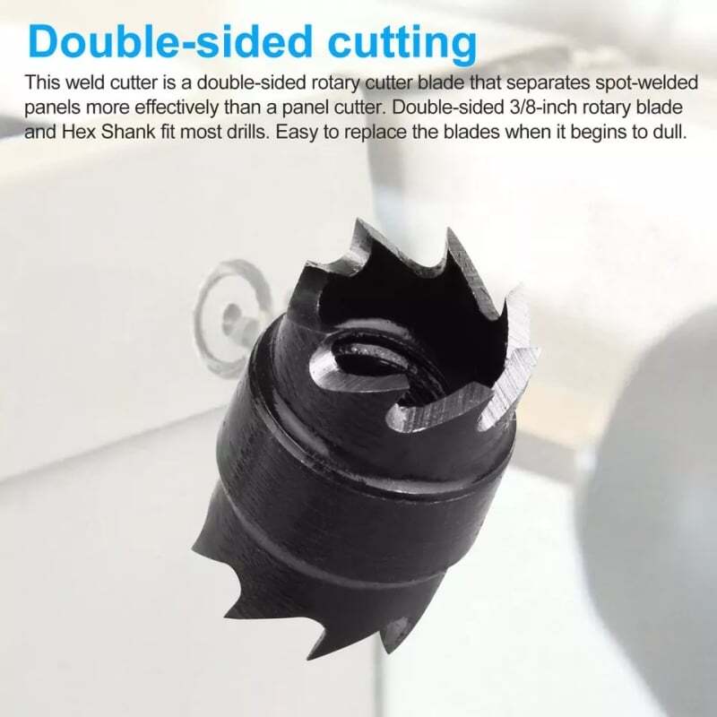 Product Feature HSS Material: Made of high-speed steel material, high hardness and wear resistance. Center pin on the bit is spring-loaded. Double-sided Blades: Sharp double-sided blades for high efficiency. Suitable for thin stainless-steel sheets, iron sheets, aluminum sheets, F.R.P, or other thin metal sheets. Spot weld cutter drill bit for easily separate spot-welded panels without distorting the sheet metal. Separate Spot-welded sheet metal, panel, etc. and cut small access holes. This weld cutter is a double-sided rotary cutter blade that separates spot-welded panels more effectively than a panel cutter. Double-sided 3/8-inch rotary blade and Hex Shank fit most drills. Easy to replace the blades when it begins to dull. Product Specification Type Double Sided Rotary Spot Weld Cutter Material HSS Diameter of the Saw Tooth Part 3/8"(9.5mm) Use Iron, cast iron, alloy steel, carbon steel, die steel Package Included 1 x Electric Welding Drill Kit (Including 10pcs)