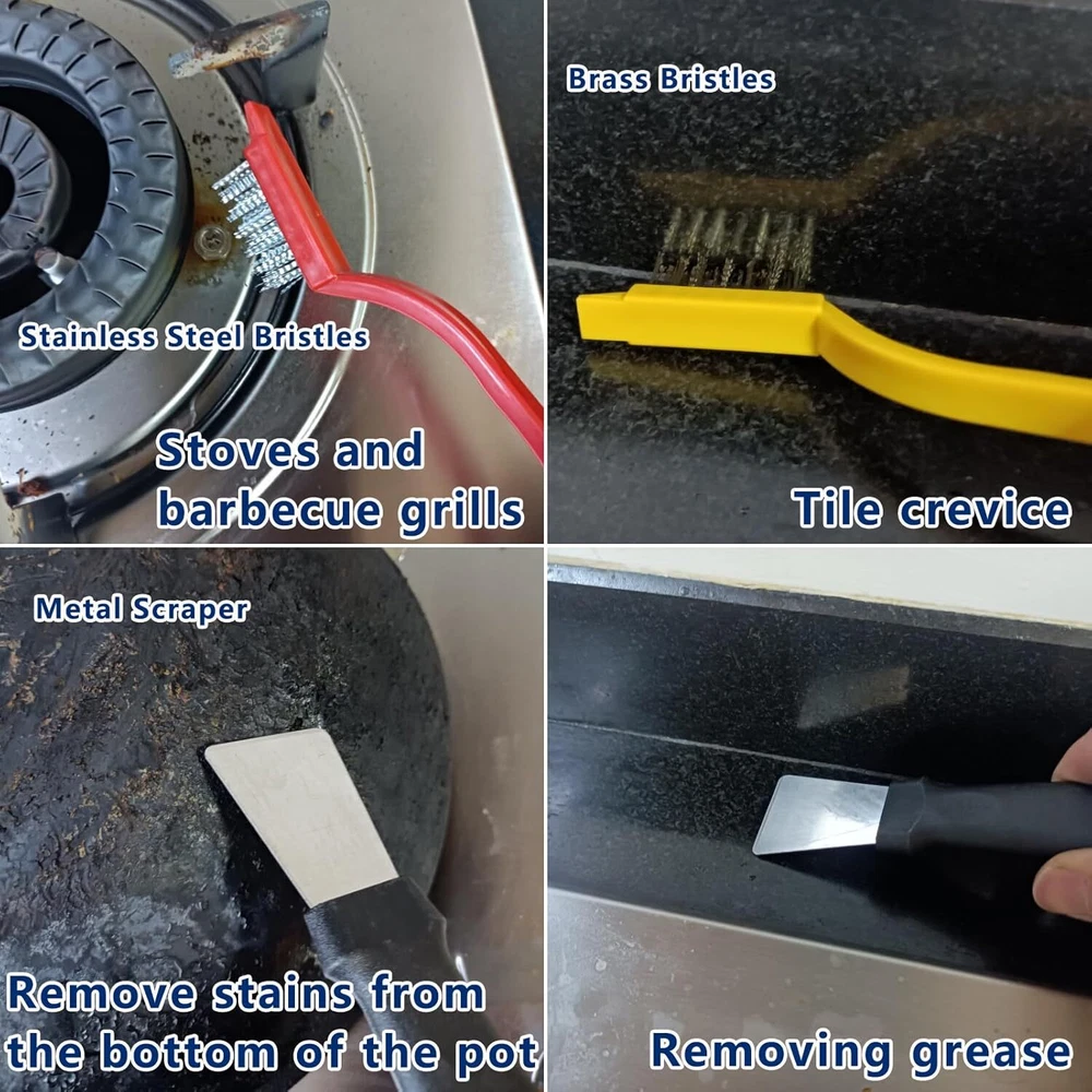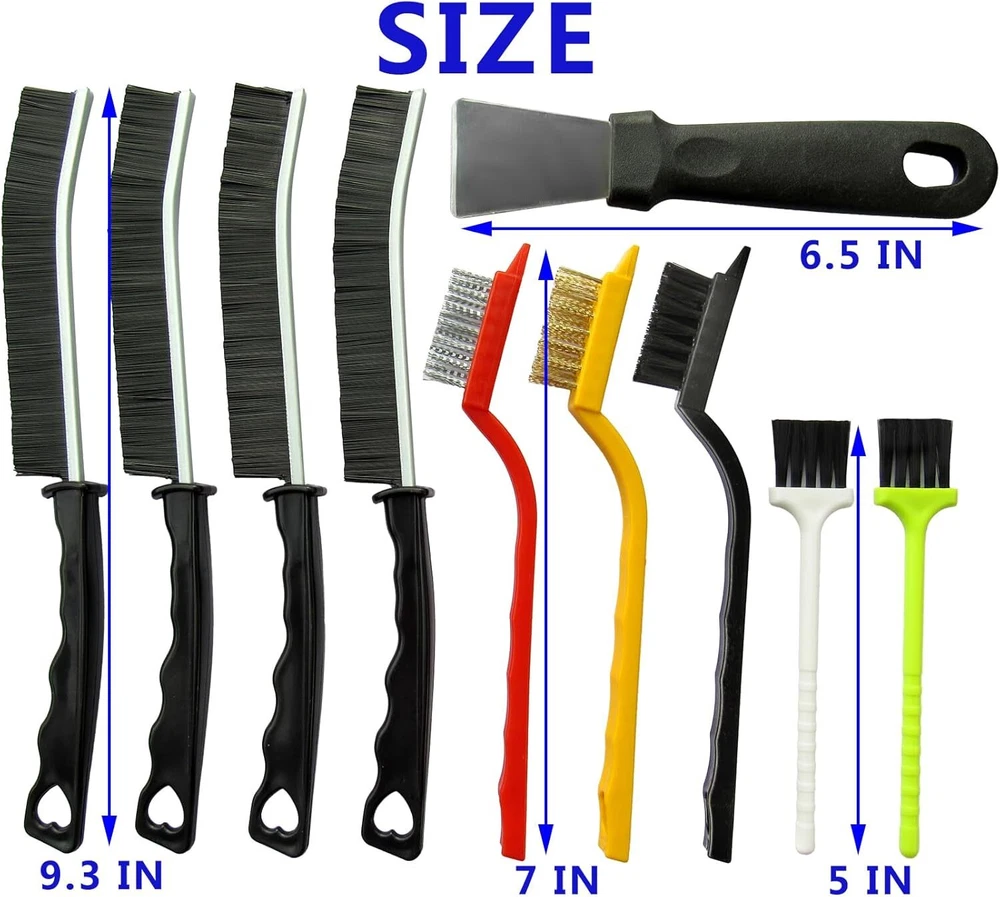 10Pcs Crevice Cleaning Tools, Gap Brush Set,Cleaning Brushes Black Product Details Brand: CRAFNEW Color: Black Handle Material: Plastic Specific Uses For Product: Window, Table, Bathroom, Tile, Door, Vehicle, Counter, Sink, Kitchen, Computer, Shower, Dish, Bathtub, Metal Cleaner Product Dimensions: 7.3"L x 1"W x 0.5"H Material: Nylon Special Feature: Durable Shape: Triangular Included Components: Scraper, Attachment Surface Recommendation: Tile, Windows Number of Items: 10 Theme: Cleaning Item Firmness Description: Hard Item Weight: 0.4 Pounds Manufacturer: CRAFNEW Item Weight: 6.4 ounces Country of Origin: China Item model number: QJS11 Specific Uses For Product: Window, Table, Bathroom, Tile, Door, Vehicle, Counter, Sink, Kitchen, Computer, Shower, Dish, Bathtub, Metal Cleaner Window, Table, Bathroom, Tile, Door, Vehicle, Counter, Sink, Kitchen, Computer, Shower, Dish, Bathtub, Metal CleanerWindow, Table, Bathroom, Tile, Door, Vehicle, Counter, Sink, Kitchen, Computer, Shower, Dish, Bathtub, Metal Cleaner See more This cleaning tool set includes 4 hard bristled gap cleaning brushes, 3 different hardness gap cleaning brushes (steel, copper, nylon), 1 scraper, and 2 household appliance small brushes to meet your different requirements, easily cleaning all residual dirt and dirt. Three colored brushes provide different cleaning strengths (brass>stainless steel>nylon), and stainless steel brushes are your preferred choice for removing dirt and corrosion. A brass brush can effectively remove stubborn stains, gas stoves, and pot bottoms. Nylon brushes are an ideal choice for detailed surfaces. Very suitable for cleaning dirt in small crevices. The brush head adopts a scraper design, which can effectively remove stubborn stains. You can use this cleaning brush tool to clean window grooves, blinds, car exhaust outlets, tile lines, sliding doors, shower door tracks, refrigerators, gas stoves, sinks, computer keyboards, faucets, toilet switches, bathtubs, and more. Can be used in narrow areas, saving time and energy. Good cleaning effect and quick drying. This is a practical cleaning tool that is essential for homes, kitchens, bathrooms, offices, restaurants, and more. The gap cleaning brush is composed of high-quality ABS plastic handle and polypropylene fiber. The handle of the brush and scraper conforms to ergonomic design, providing a comfortable grip during use. The angle design of the bristles and scraper makes cleaning more convenient, efficient, and labor-saving. Easy to use, easy to apply force when cleaning stubborn stains,Easy to store, It can be hung for storage, saving storage space.