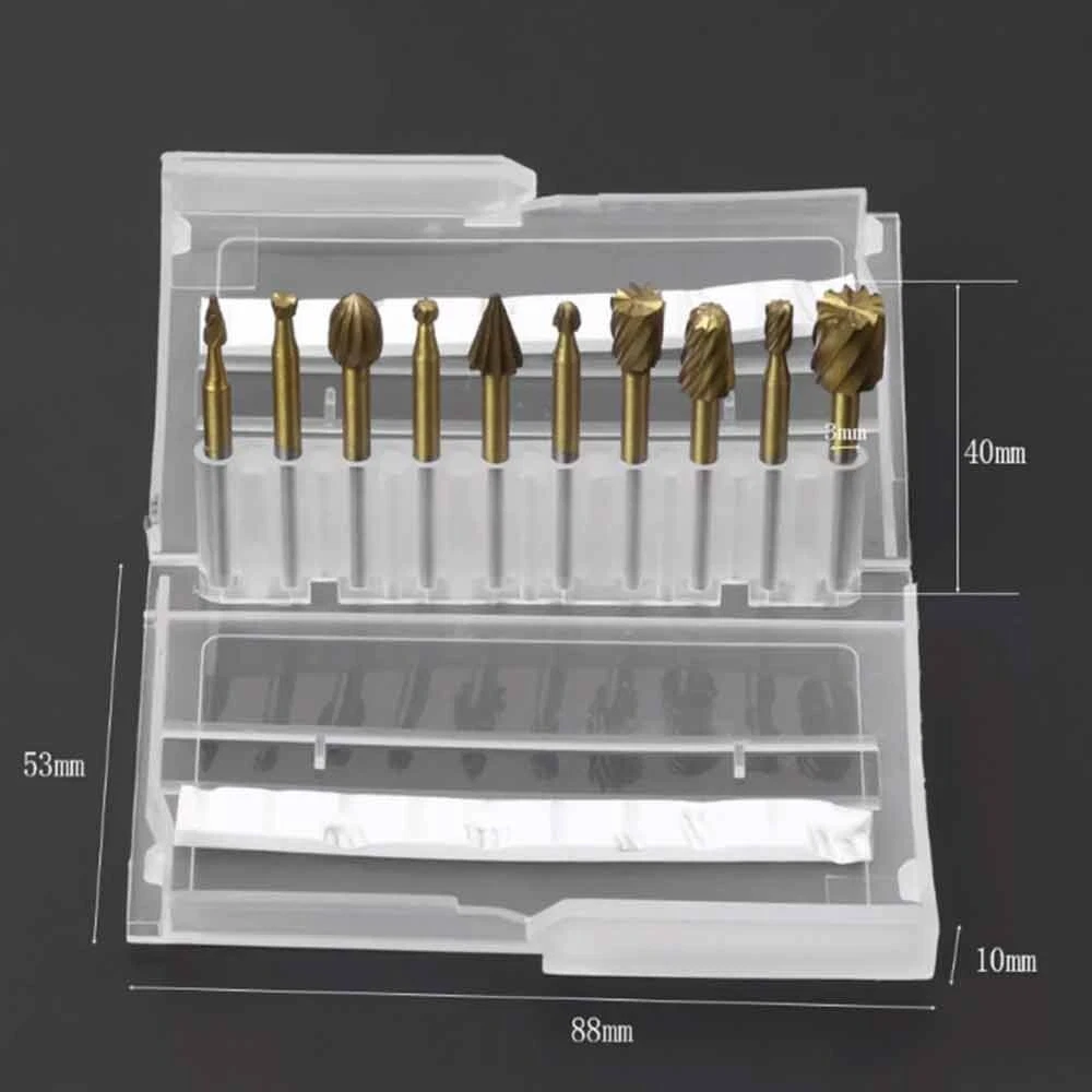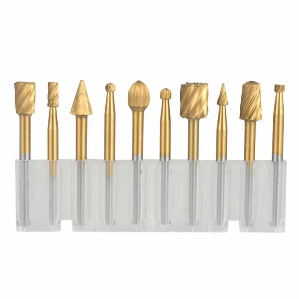 10Pcs HSS Routing Wood Carving Tools Rotary Drill File Router Bit For Dremel These Are Super High Quality Tungsten Carbide Cutting / Carving / Routing Burrs - They Will Remain Sharp For a VERY Long Time! These Burr Bits Work On Metal , Wood , Plastic , Fiberglass , PVC , And More - They Are Perfect For Cutting , Carving , Notching , Routing , And Woodworking etc. Compatible With Dremel Rotary Tools - They Have a Standard 1/8" Diameter Shank. Product Specifications: Material: Tungsten Carbide Cutter Diameter: 1/4" (6mm) Shank Diameter: 1/8" (3mm) Shank Length: 22mm Total Length: 40mm Compatible With Dremel Rotary Tools Tungsten Carbide Burrs Easily Cut, Carve, And Notch The Following Materials: Metal Wood Plastic PVC Fiberglass Iron Carbon Steel Stainless Steel Aluminum Stone Ceramic & Porcelain Plastic, Carbon Fiber Reinforced Plastic (CRP), Glass Fibre Reinforced Plastic (GRP) Brass, Copper & Bronze Gold, Platinum & Silver And MUCH MORE Package Included: 1x Set Drill bit