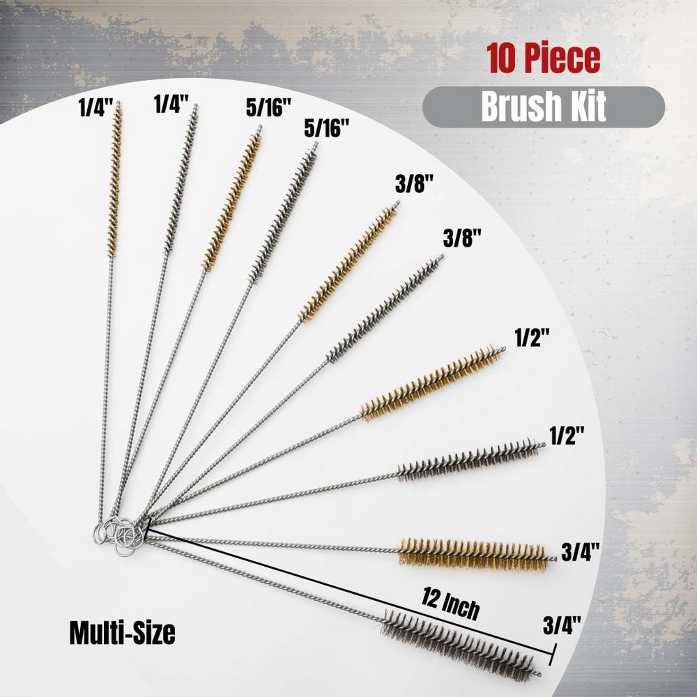 Tube Brush Kit 10 Piece Brass & Stainless Steel Bristle * Brass brushes: 1/4", 5/16", 3/8", 1/2", 3/4" * Stainless steel brushes: 1/4", 5/16", 3/8", 1/2", 3/4" * 4" long brush area * Brushes are 12" overall length * Twisted wire handle with loop Multi Size Cleaning Brush Kit: This 10-piece Tube Cleaning Brush Kit includes 5 steel wire brushes and 5 stainless steel brushes in various sizes, from 1/4" to 3/4". Ideal for engine cleaning, metal rust removal, and detailed cleaning tasks. It's your go-to set for thorough cleaning! Access Hard-to-Reach Areas: These 12" metal brushes with a 4" brush area easily clean 3/8 stainless steel tubing, tight spaces, and narrow areas. Heavy-Duty Build: Designed with twisted wire handles, flexible shaft and a storage loop, these durable metal brushes are designed for tough cleaning tasks, making them perfect for heavy-duty use. Safe and Cautious: This kit includes brushes for rust, steel, and stainless surfaces, making it versatile for various cleaning tasks. Please be careful and keep away from children. Always wear protective glasses while using these tools to ensure safety. Customer Satisfaction Guaranteed: If you have any quality issues with the product, us for a .