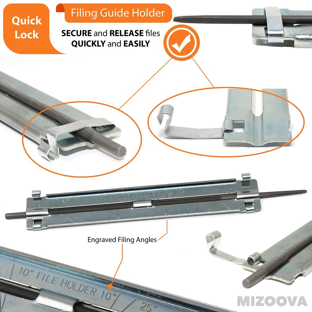 10 piece chainsaw sharpening kit, sharpens chain blades quickly, affordably and effortlessly Durable 5/32, 3/16, 7/32 inch round files, can be used on a wide variety of chain types and pitch File guide with quick lock and release mechanism; engraved angles help with alignment when filing Includes: 3 files, file holder, flat file, depth gauge, bar groove cleaner, quick check gauge, pouch Measures 11.02 x 3.15 x 1.18 inches; Weighs 13.4 ounces