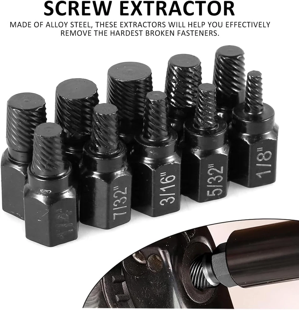 This screw extractor set is a lifesaver for stripped or broken bolts! The hex head design gives a solid grip, and the multi-spline teeth bite into damaged screws effortlessly. The 10-piece variety covers different sizes, making it super versatile. Easy to use with just a wrench—no batteries needed. Compact and well-made, it’s a must-have for any toolbox. Saved me hours of frustration!
